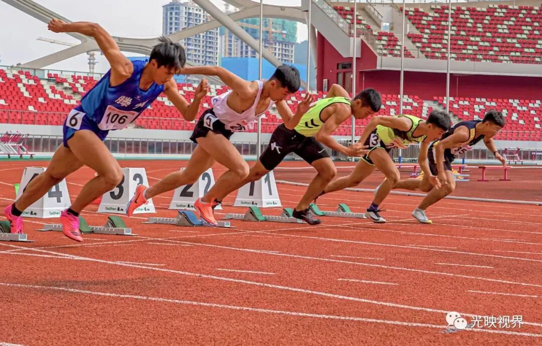 随图文字:枣庄市第十届运动会田径比赛在新城区主体育场举行,男子百米决赛的健儿们起跑瞬间,就像健与美的交响,给人以奋发向上永不服输的激励。