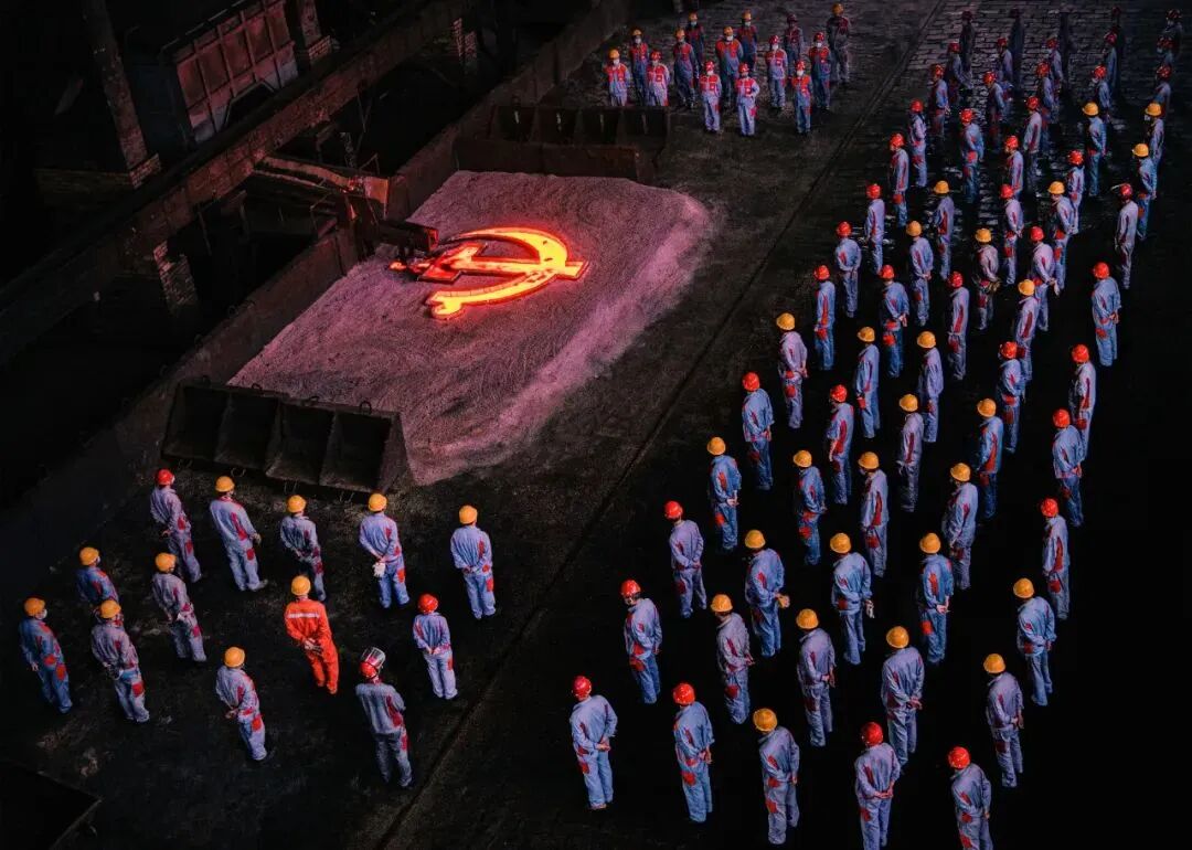 随图文字:2020年7月14日,中信锦州金属股份有限公司党员干部围绕在一枚直径3米、中锰钢浇铸的中国共产党党徽周围,开展党日宣传活动。王乃功 摄(“筑梦——我们的新时代美术 摄影作品展”参展作品)