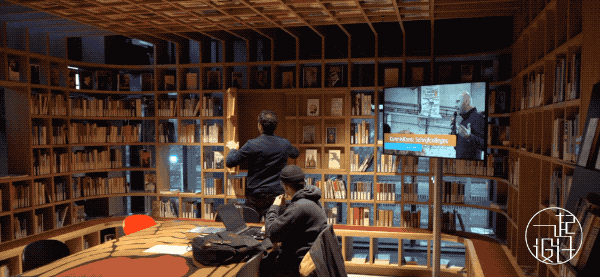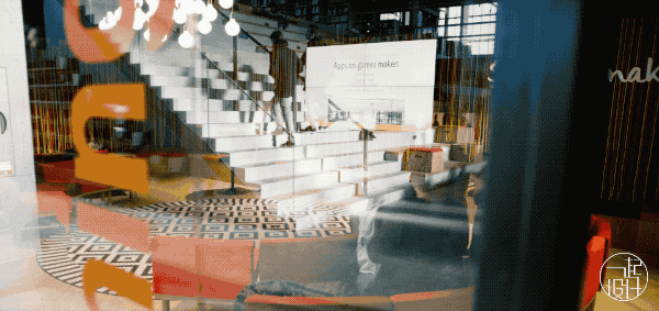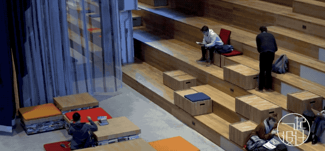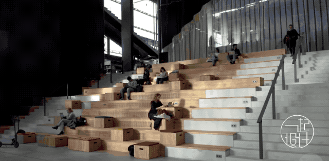 当需要举办例如演讲、沙龙等活动的时候,就可以将中央的台阶区域用幕布包围起来,形成一个巨大的会议空间。