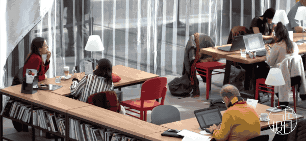 在咖啡馆的另一边能看到 3 张巨大的桌子,人们在这上面阅读、工作、讨论工作或者学习▽