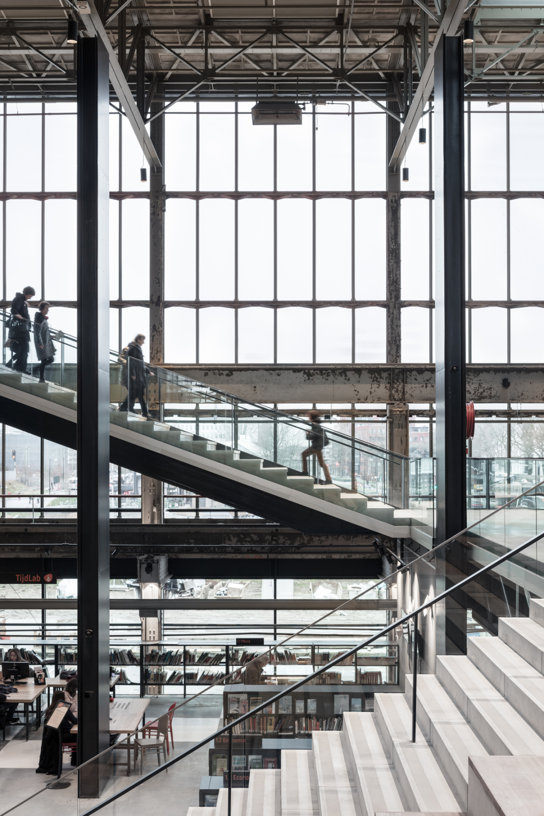 这个建筑外立面以玻璃幕墙为主的钢结构建筑,位于荷兰,是一个结合市民公共图书馆、咖啡厅、联合办公、文化艺术中心等多功能的一个「文化场所」。