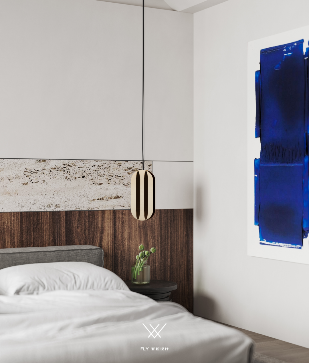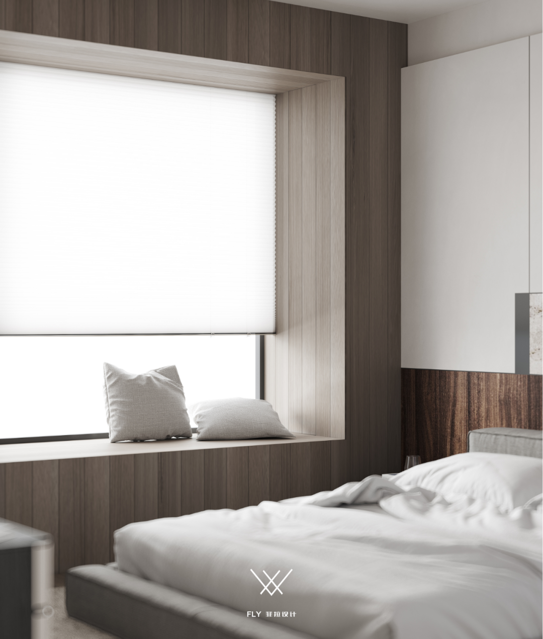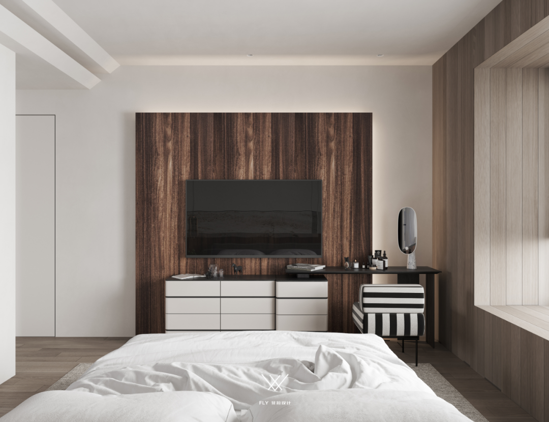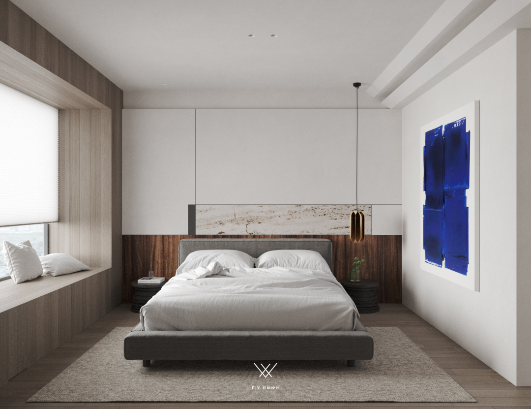 Indulged in the form expression of deconstruction lines and blocks in space, the bedside background modeling of the master bedroom contains the interest of structure, the collision of materials, and the dark echo of colors; The point of the sleeping space is just right with the gentle progress of leisure, and the meaning of the restraint expression is still endless.