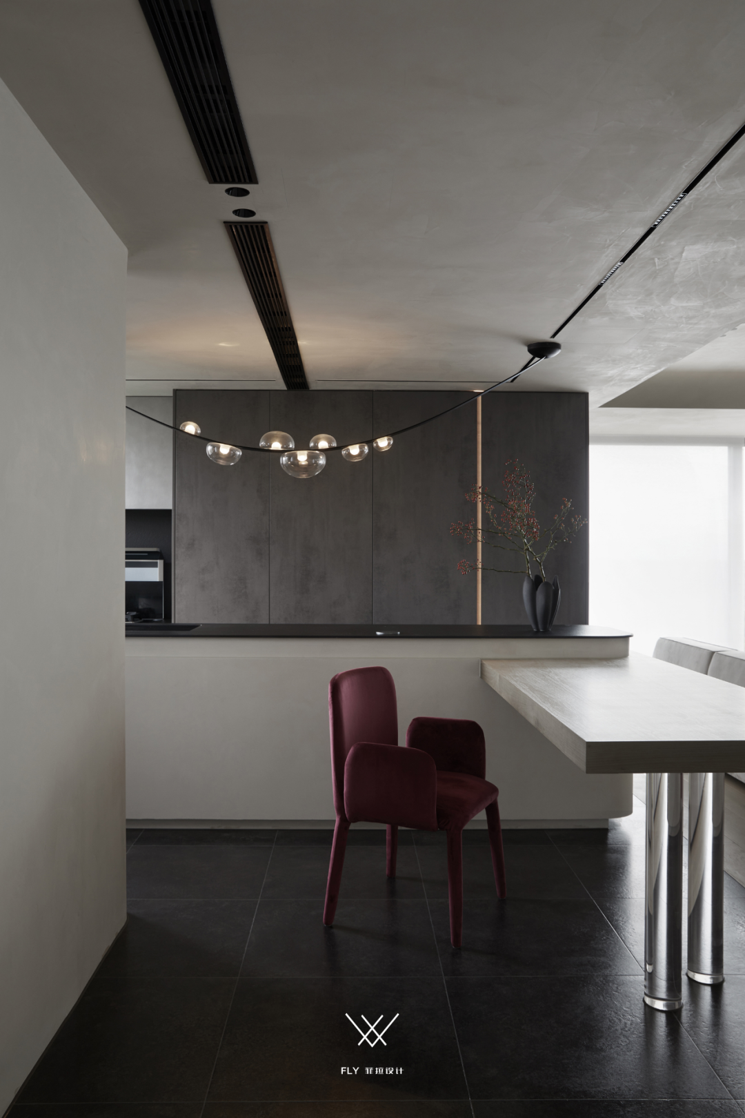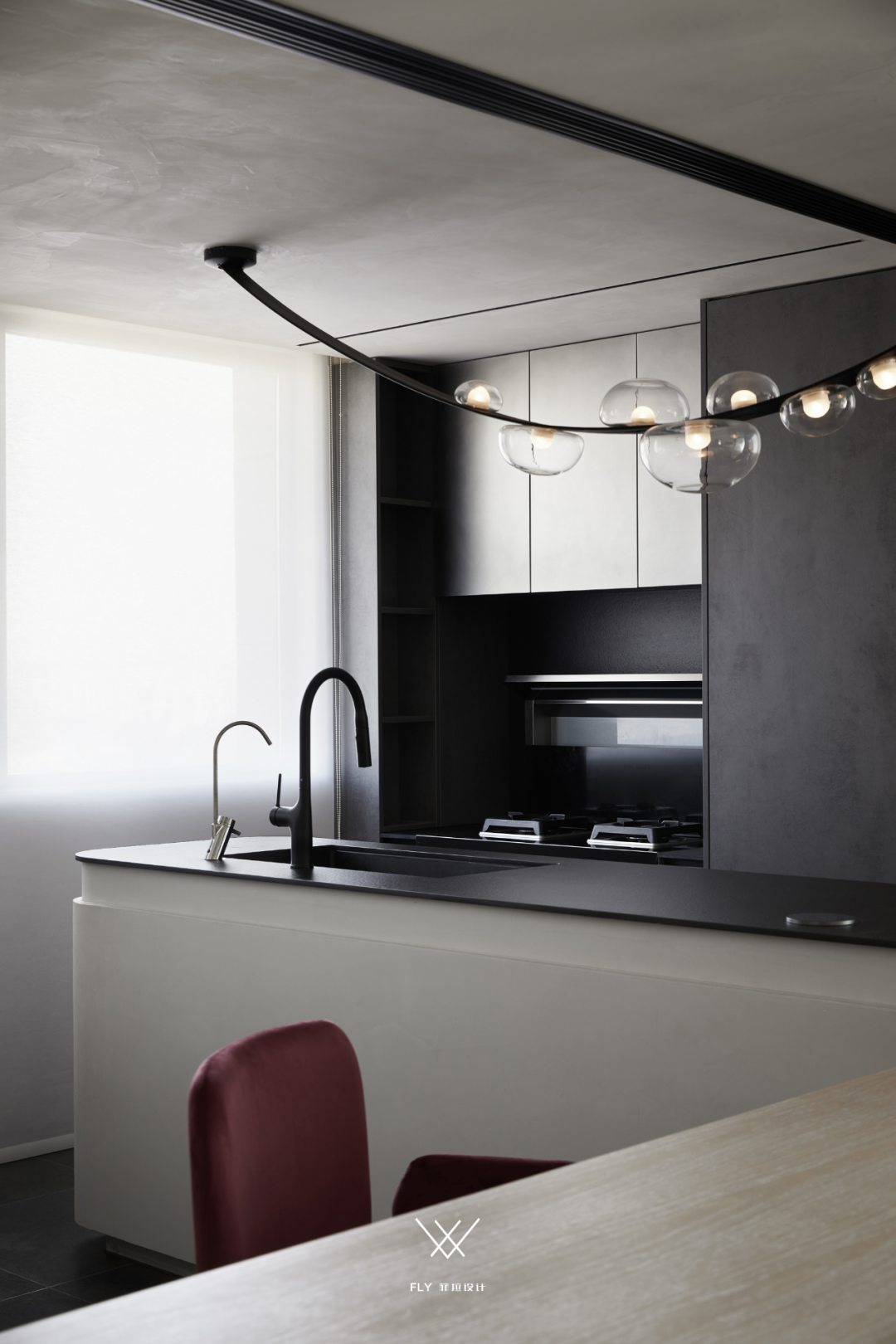 厨房操作区部分柜体用银色来调节大面积深色带来的沉闷气氛,基于日常使用中的安全考量,厨房岛台四角做弧度处理,色彩进行区域划分与大空间呼应,透明的亚克力材质餐桌腿减少空间上的堆积感,点点滴滴完善功能区的细节表达。