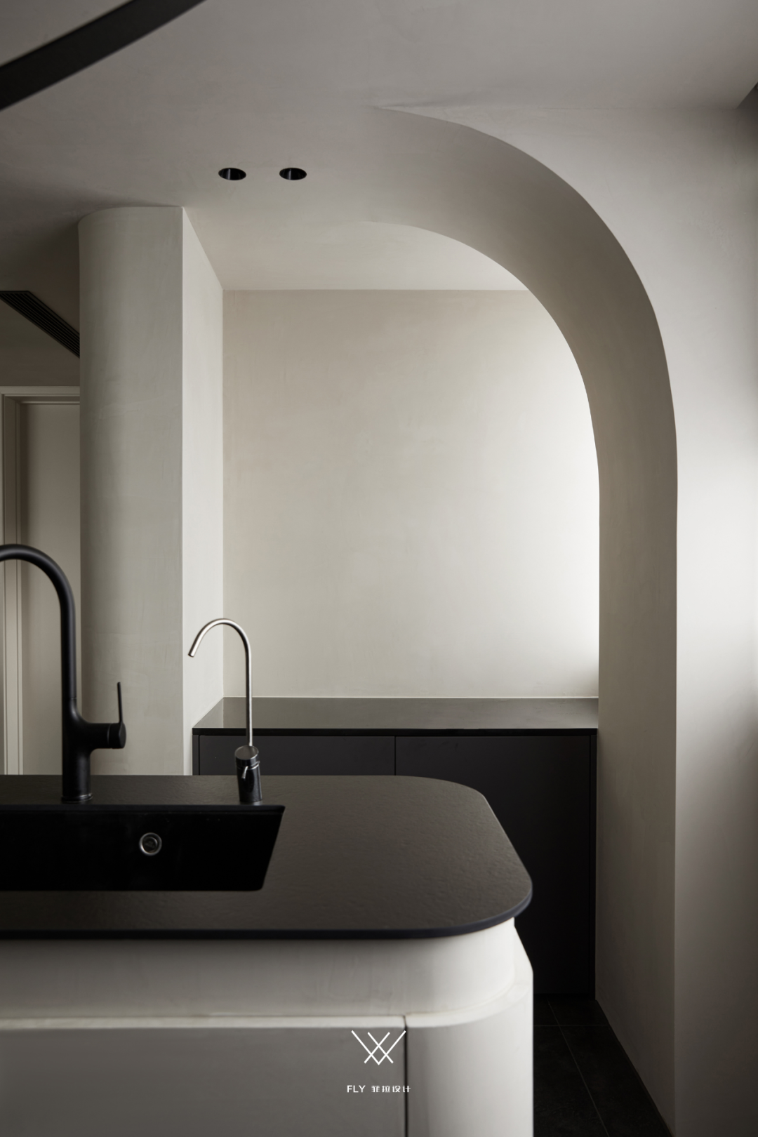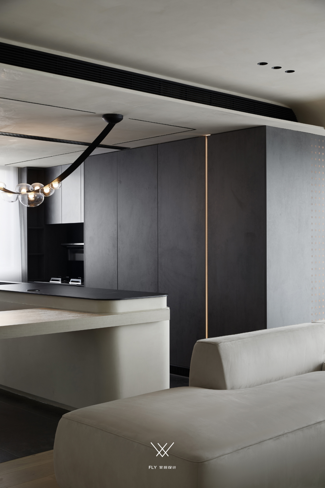 Some cabinets in the kitchen operation area use silver to adjust the dull atmosphere brought by the large area of dark color. Based on the safety considerations in daily use, the four corners of the kitchen island are radian treated, and the color is divided into areas to echo the large space. The transparent acrylic material table legs reduce the sense of accumulation in space, and improve the detailed expression of the functional area bit by bit.