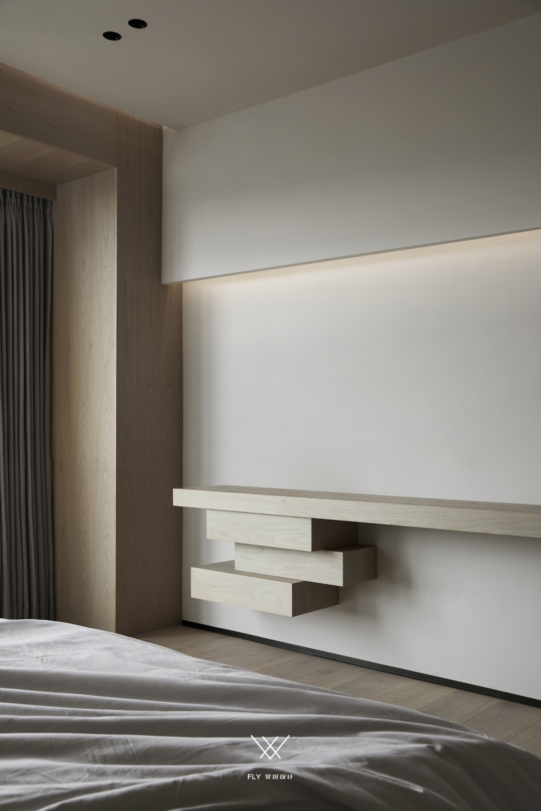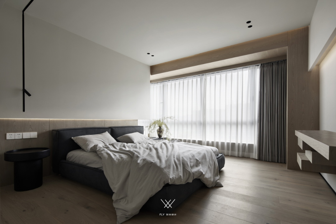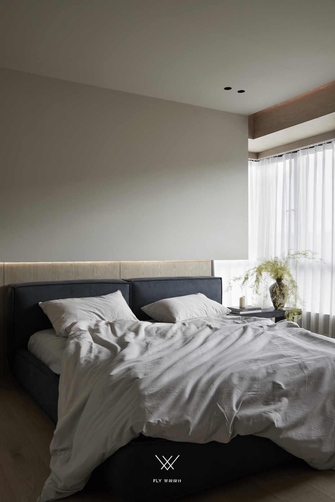 Taking the L-shaped window as the base point, the wall above the bedside backrest is cushioned inwards in the form of a block and extended to the window edge to create a background shape, which can expand the bed background wall without shading the light, so that this wall is evenly stacked. The lower part of the wall is decorated with wood veneer, and the proportion, material and color are balanced.