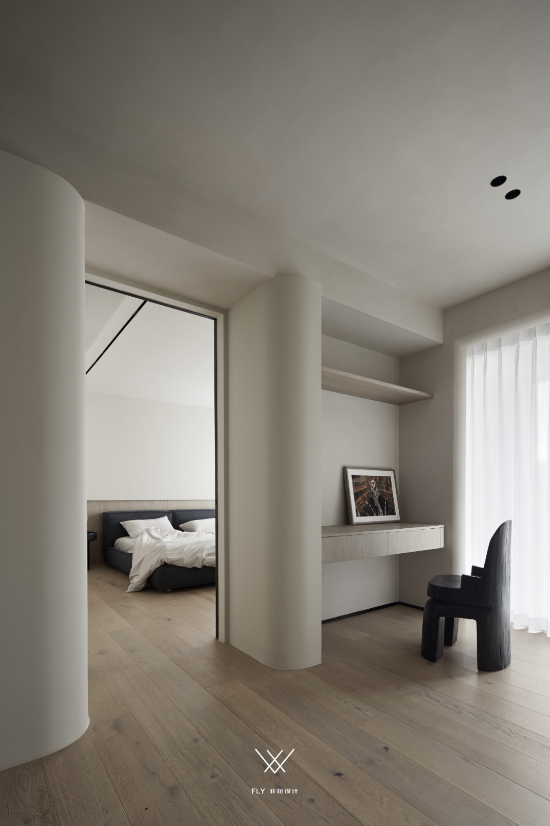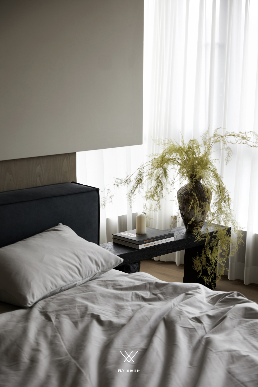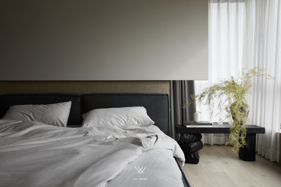 Taking the L-shaped window as the base point, the wall above the bedside backrest is cushioned inwards in the form of a block and extended to the window edge to create a background shape, which can expand the bed background wall without shading the light, so that this wall is evenly stacked. The lower part of the wall is decorated with wood veneer, and the proportion, material and color are balanced.