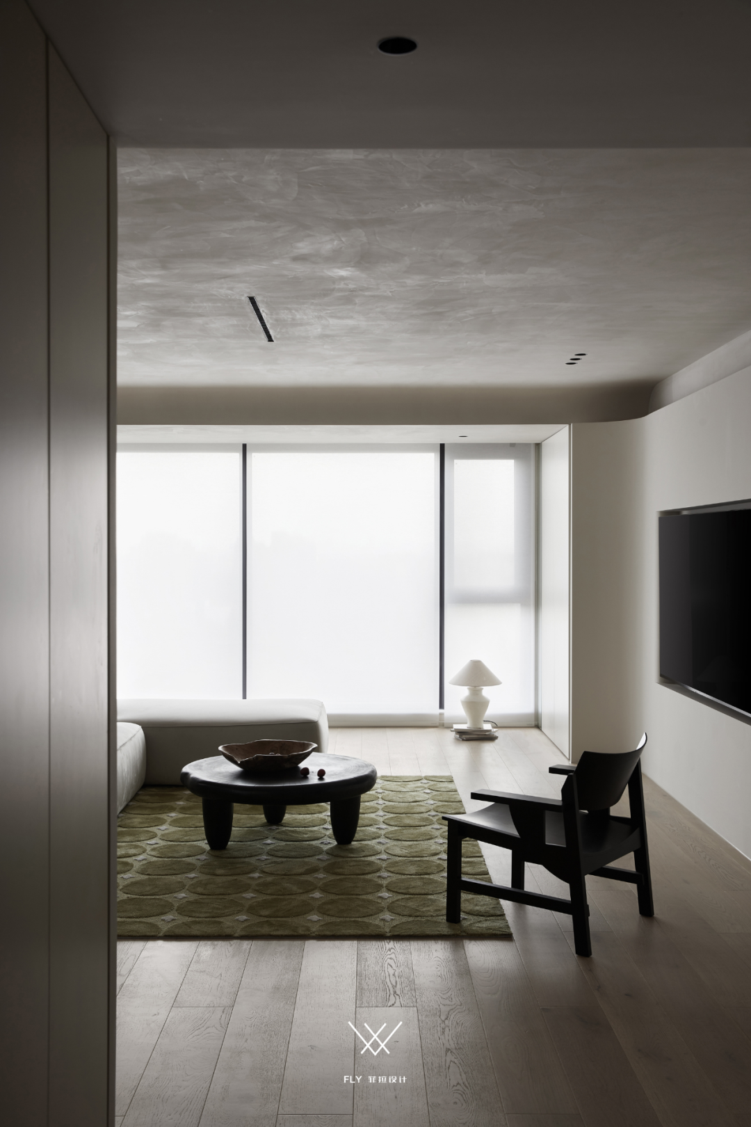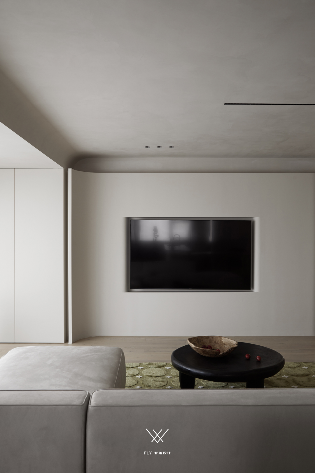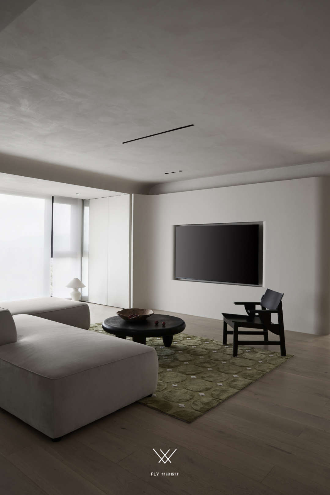In order to present the harmonious integration of the space after remodeling, the balcony space incorporated into the living room is connected with the interior, and the TV background modeling is used to contact. The euphemism of the curved surface is the aesthetic language of the visual space, focusing on the harmony and smoothness of multiple construction, and the top surface is also echoed with the arc processing, creating a natural sense of space modeling.