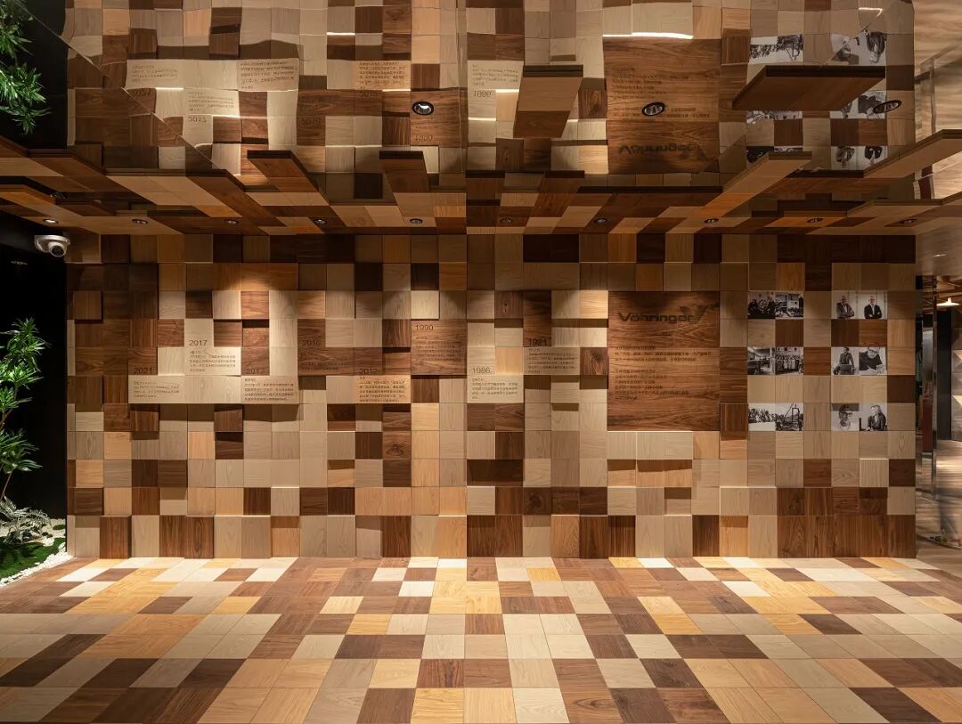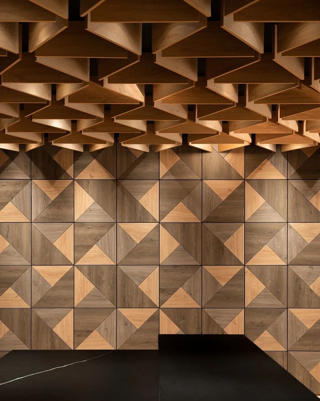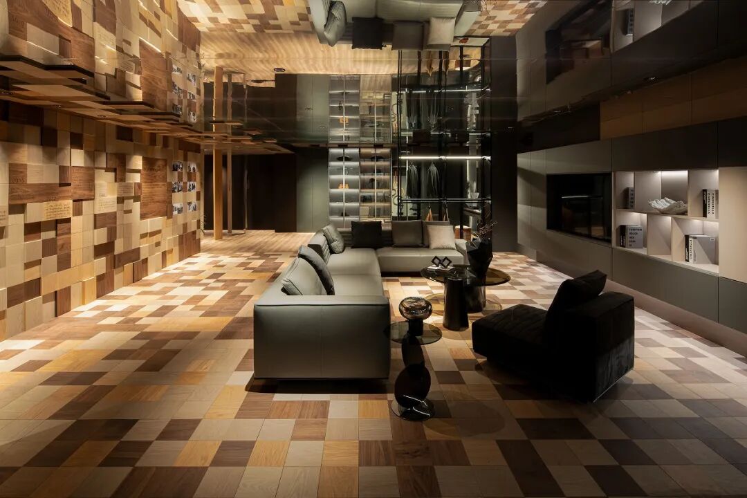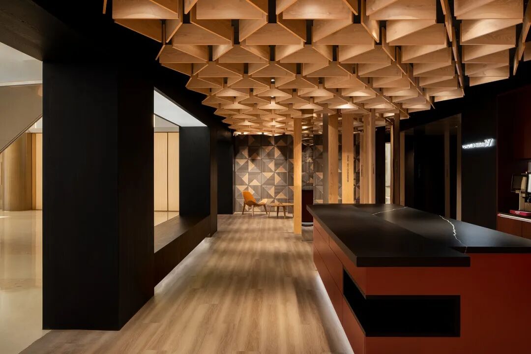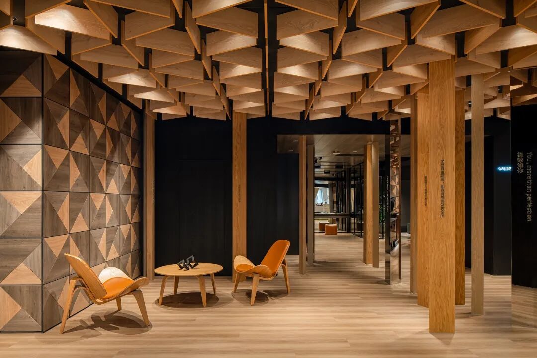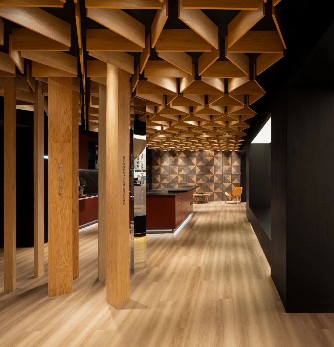 展厅前厅,通过产品梳理动线与功能区域。菲林格尔品牌大胆运用顶面空间,通过木块几何方形的排列,将原本的木地板产品融入硬装,从顶面延展至墙面,形成大尺度的反重力感刺激人的感官体验,展现出空间的自由性与秩序性,整体节奏统一。开阔空间打破了僵化的功能布局,提供了空间自由与活力,体验者可沉浸于殿堂般的空间之内。