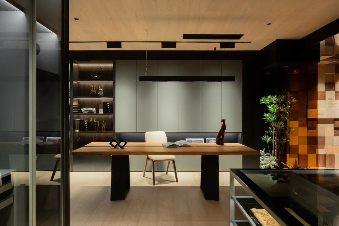 空间不仅仅是一个承载生活的容器,更将德系精工系统和秩序用设计语言进行了理性表达。顶部的木块阵列,展现了当代结构艺术,体验者身处其中仿若可与包豪斯展开隔空历史对话。