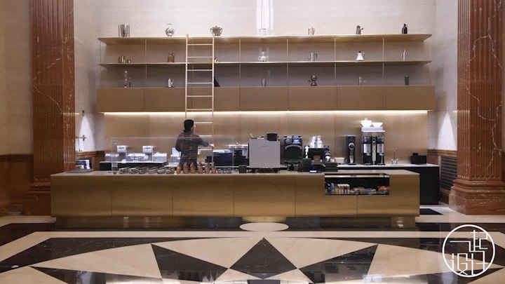 咖啡厅大量使用黄铜元素来贯穿,优雅而时尚,可移动式梯子帮助工作人员更轻松拿到高处的物品。