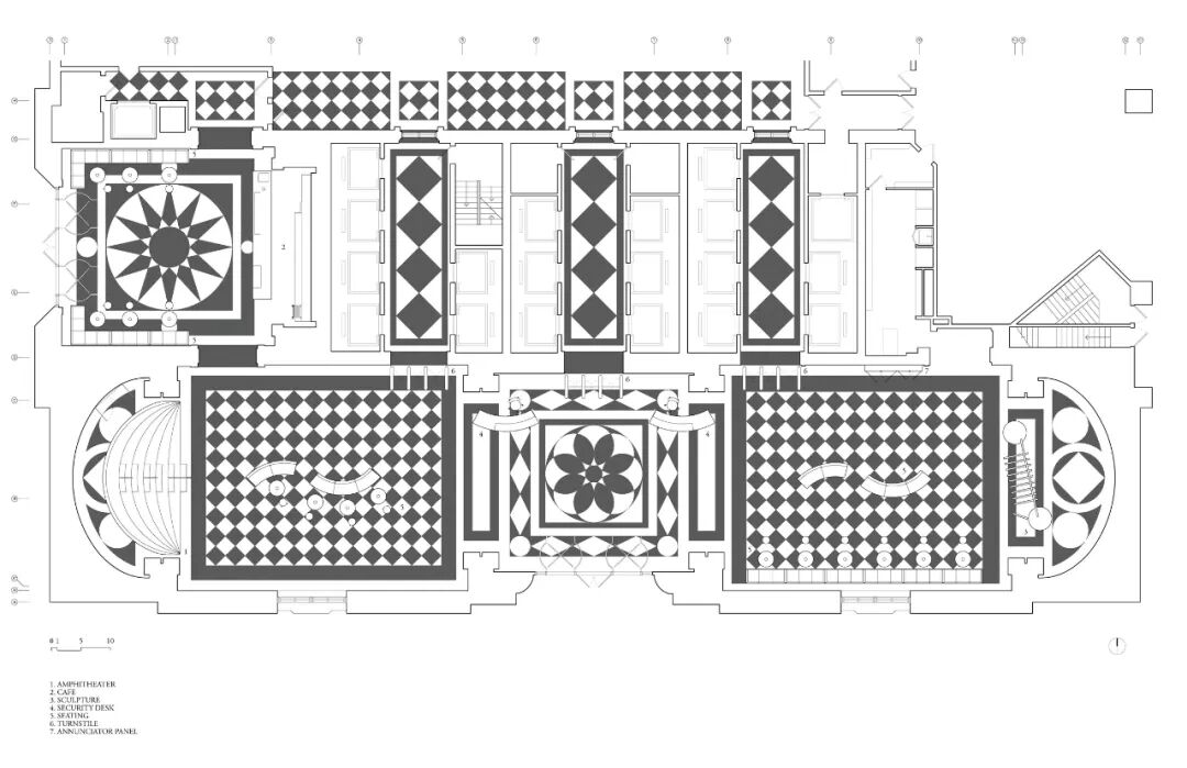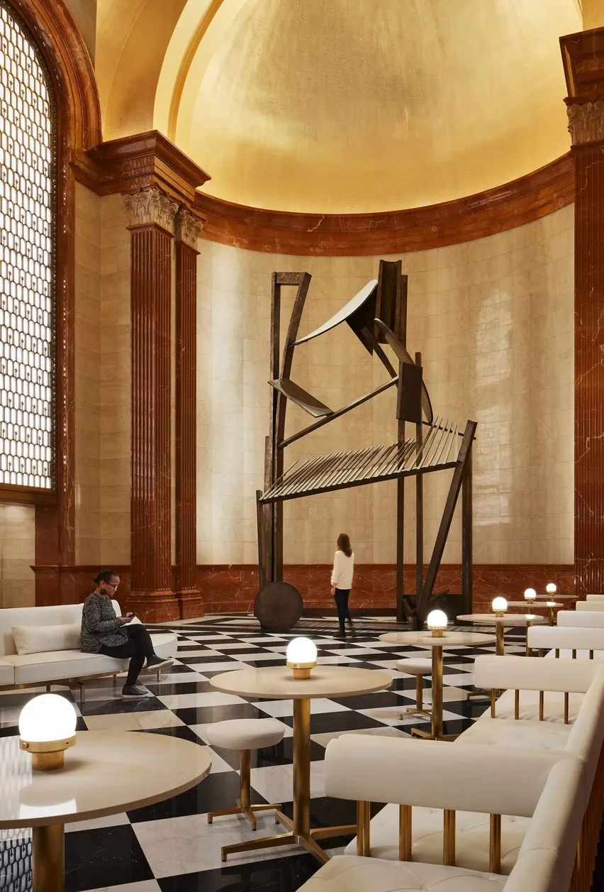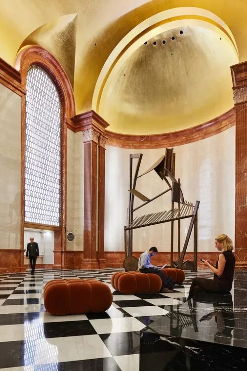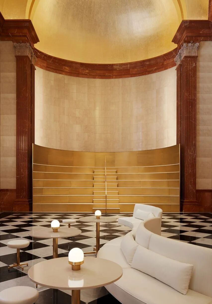 原有大厅内,高达15米的金色拱形天花板恢宏大气,结合玫瑰色的大理石壁柱、黑白棋盘纹大理石地板