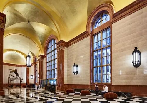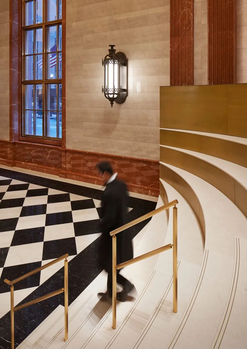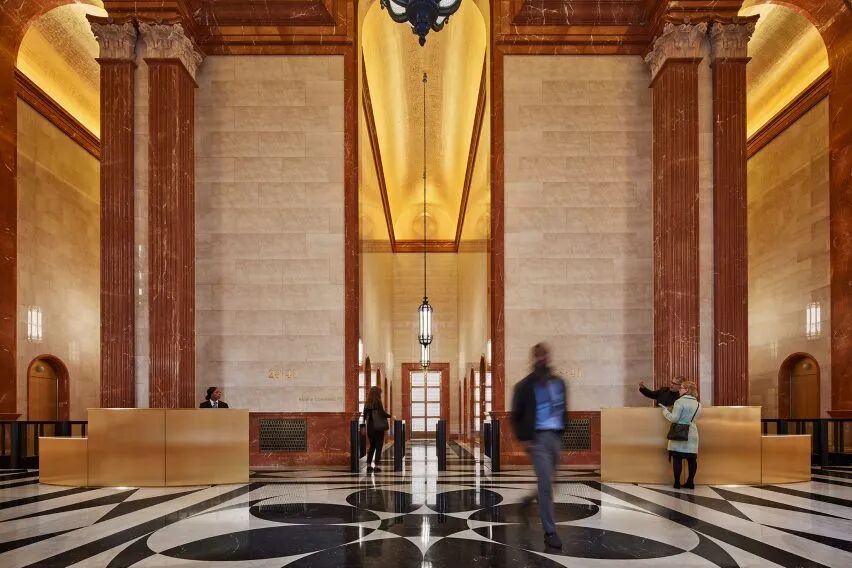 由美国建筑工作室 Norman Kelley 更新改造后的大堂,原本顶部的弧形元素、拱形入口和门廊及带图案的水磨石地板等极其鲜明的风格特征得到保留,设计师在致敬约翰逊最初设计的同时,新增了黄铜和抛光大理石材料。