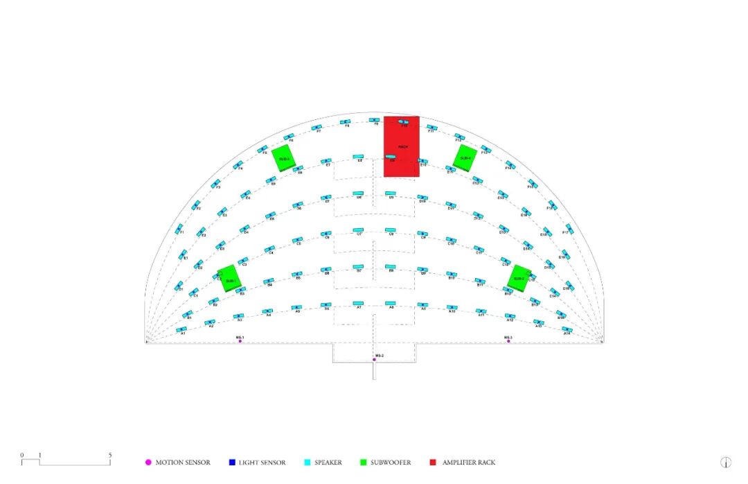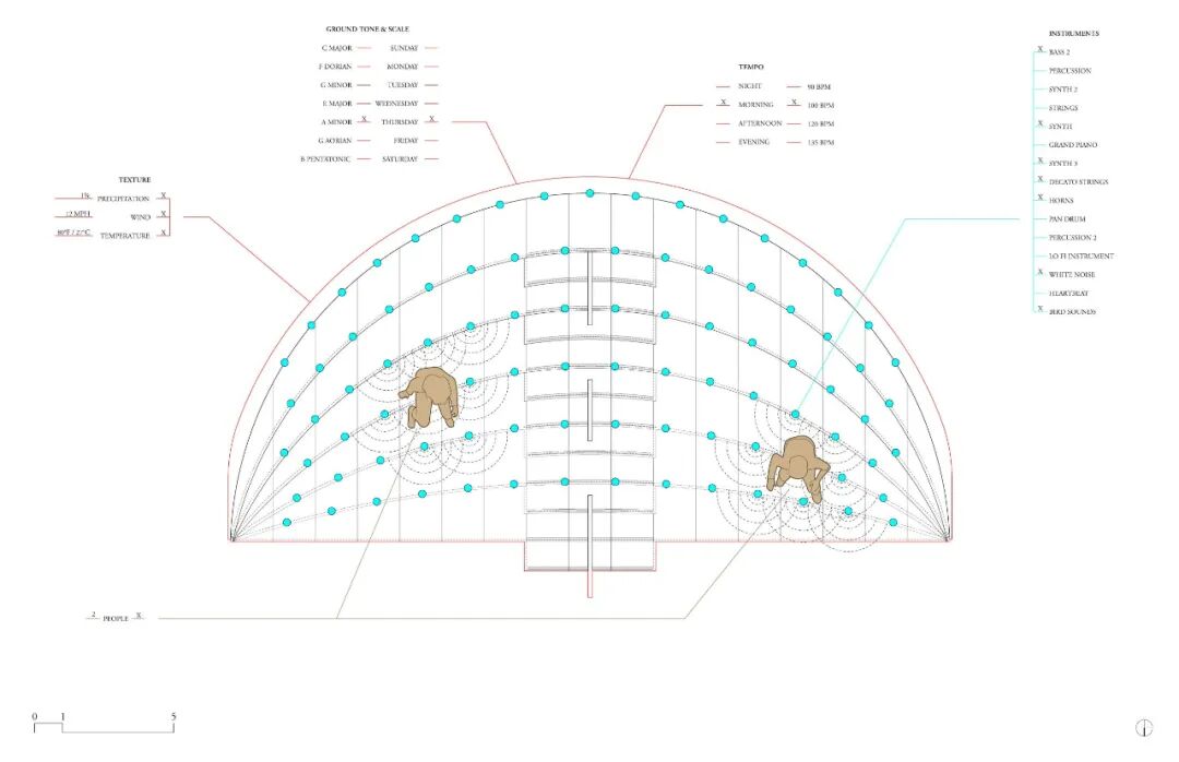 剧场周边分布91个扬声单元,它们可以调节声音,使噪音污染最小化,并提升听众的体验。当感应到有人经过,最靠近人的8个扬声器便会开始演奏,音乐的内容则由不同的天气、时间的变化来自动生成