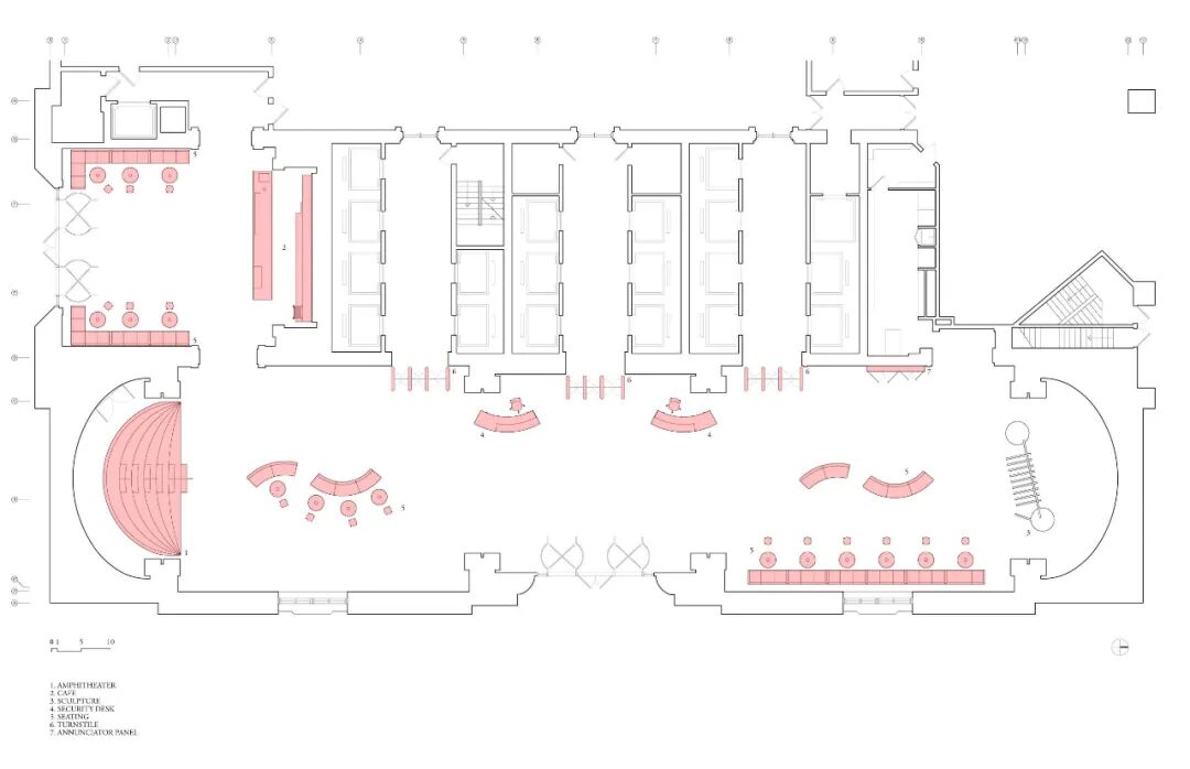 然而,此次半圆小剧场的声学设计却颇具挑战。大堂天花板的高拱顶设计影响了声音传播,“当你站在7英尺远的地方时,你根本听不懂别人在说什么。”
