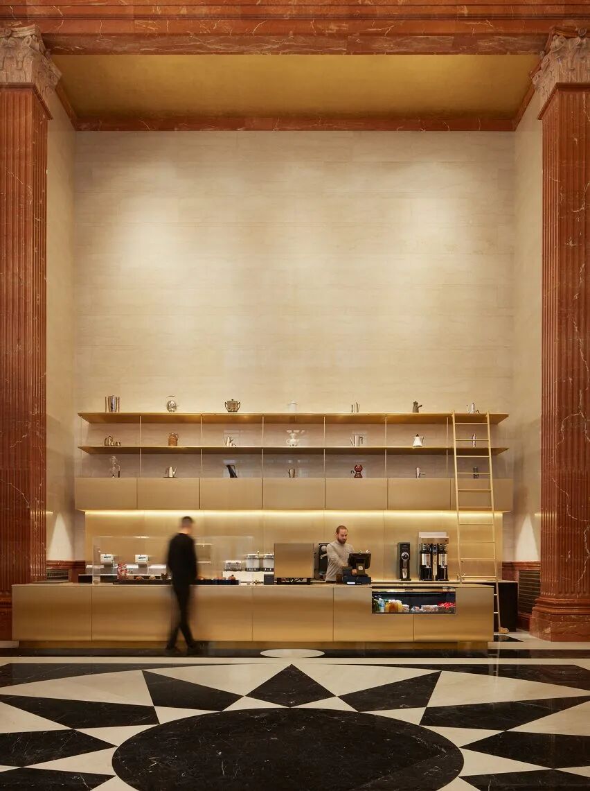 咖啡厅面板发色与大堂的金色拱顶相呼应。