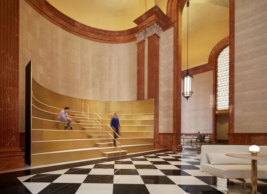 分层座椅由穿孔黄铜板和磨光的灰白色大理石制成,楼梯扶手散发金色光泽