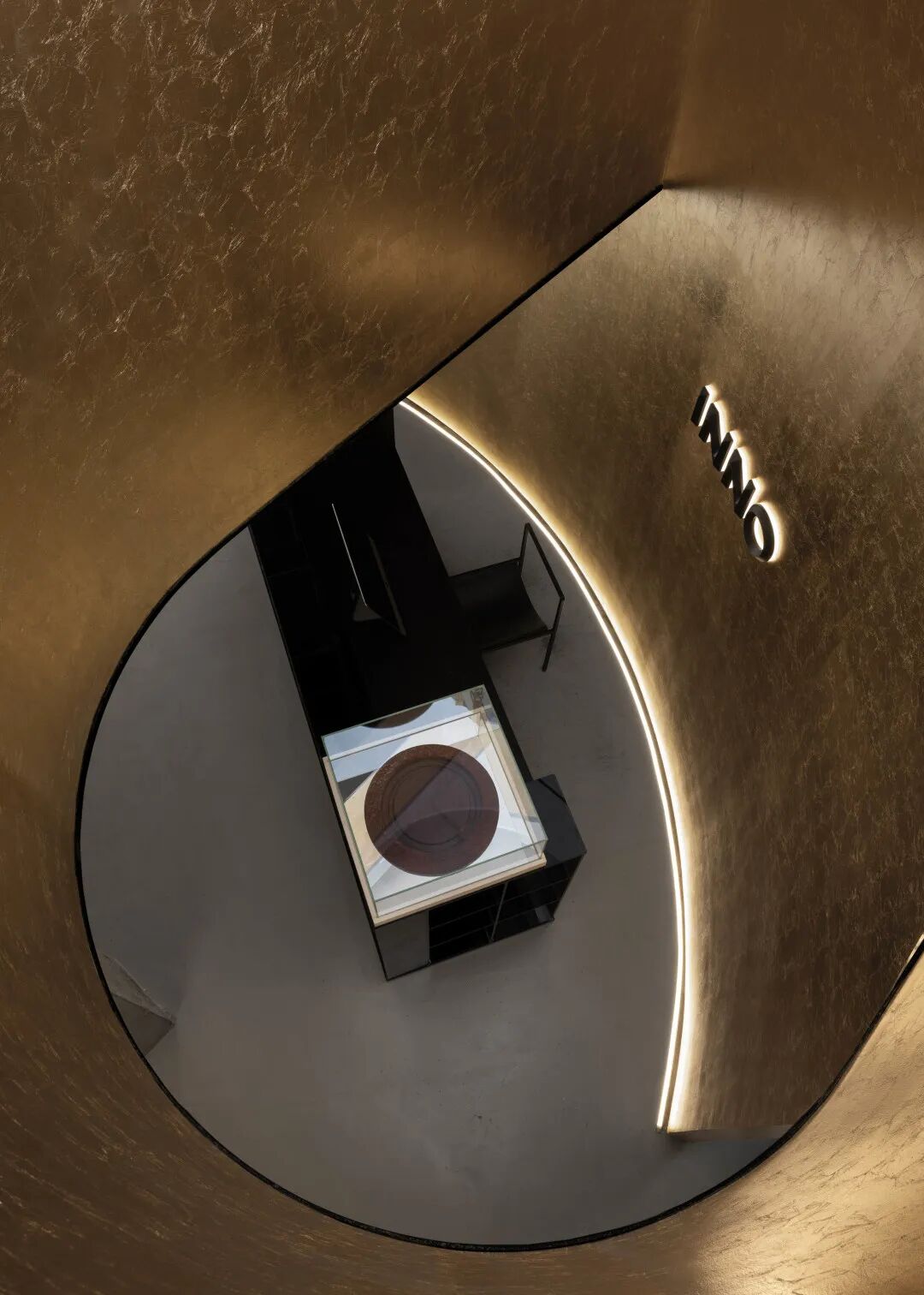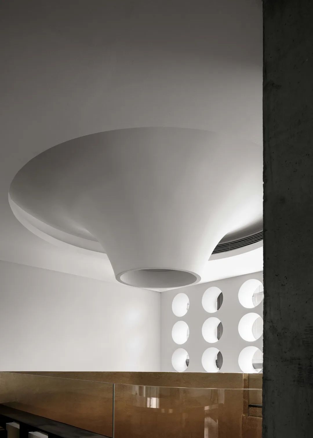 将意识随着金色向上流动,收聚于楼上咖啡厅顶端,空间联系在上下互动中再次增强。探照灯一般的排窗前后呼应,与天花处的未来之眼相互映射。在圆形的世界中探视、俯瞰,视觉的欺骗性将具象与虚拟折叠。