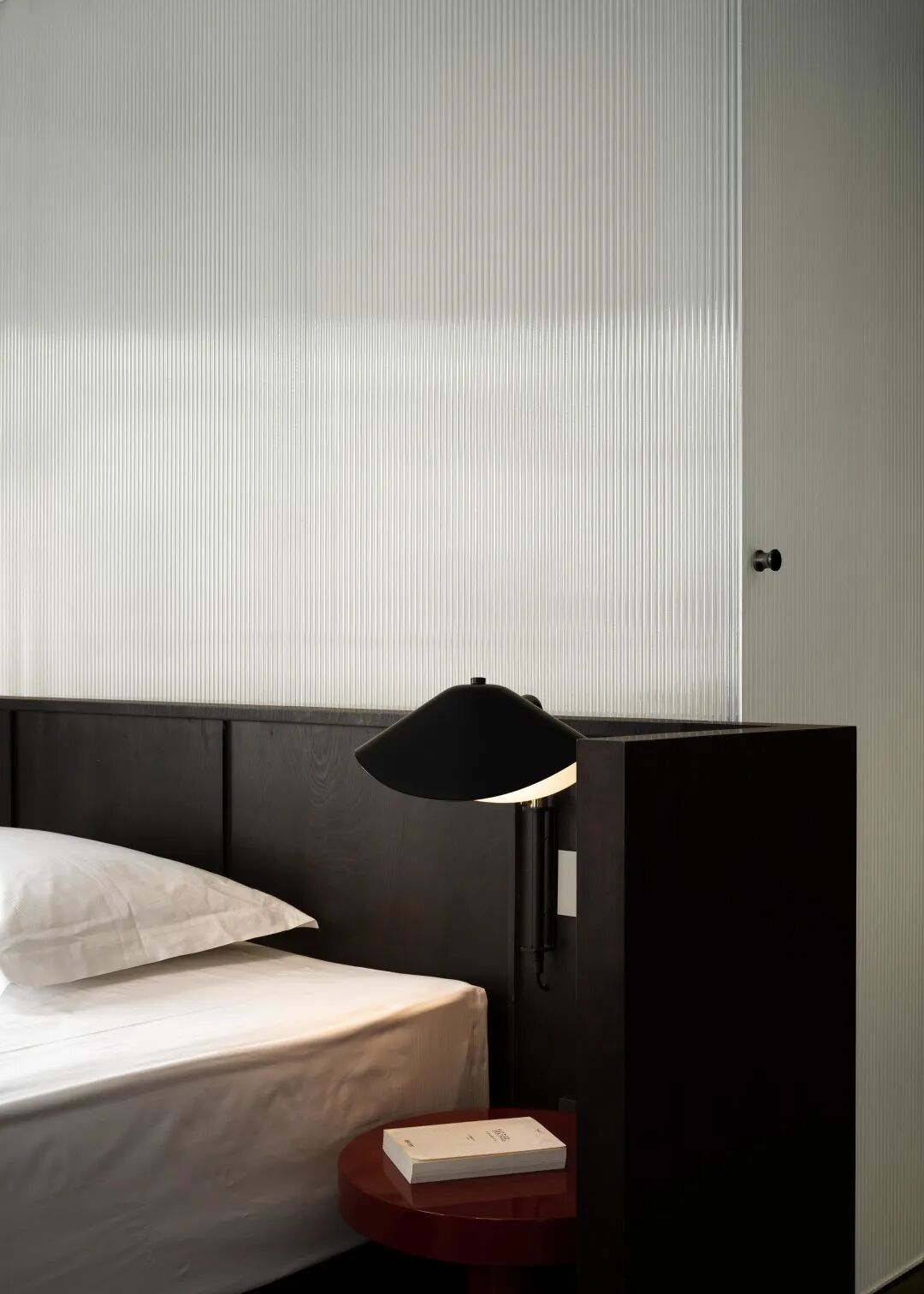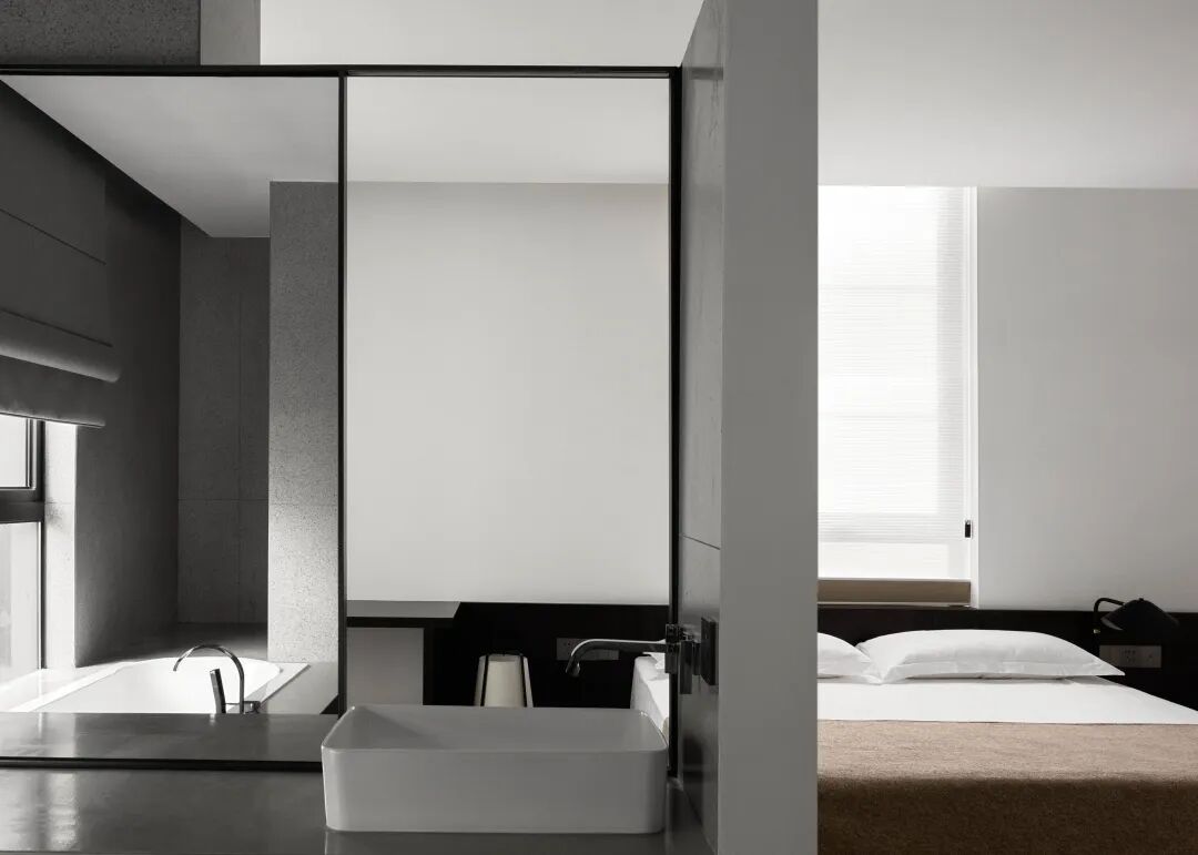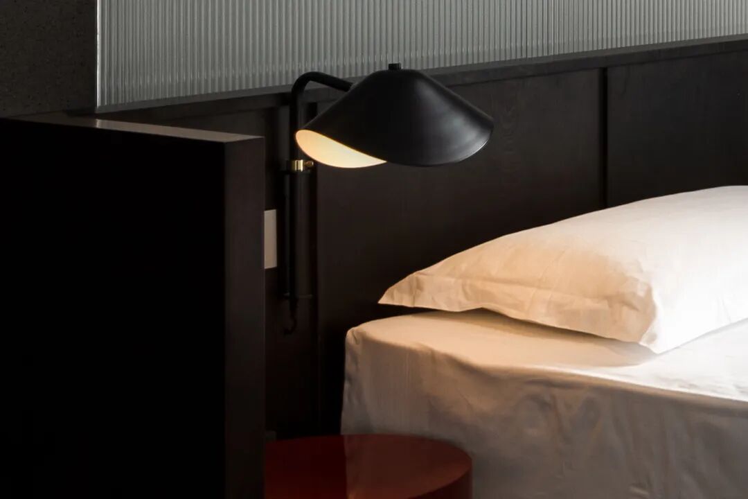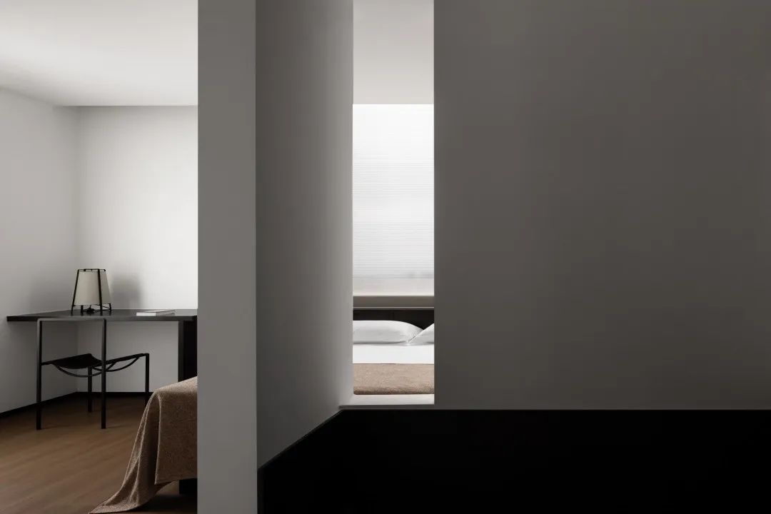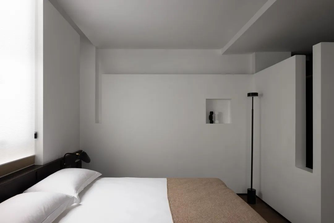 床头半裹于醇厚木体中,复又笼罩于溶溶灯光下,保护式的叠加设计带给入睡者更多的安心感。黑色在此空间中再次置入,给予一种感官上的放松的明示,与白色的主色调共同围合起足以让人全身心沉浸的舒适环境。