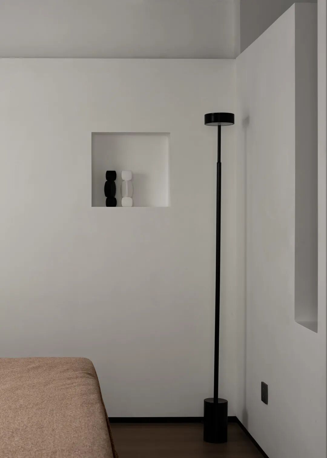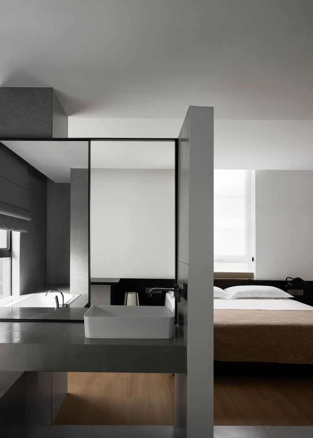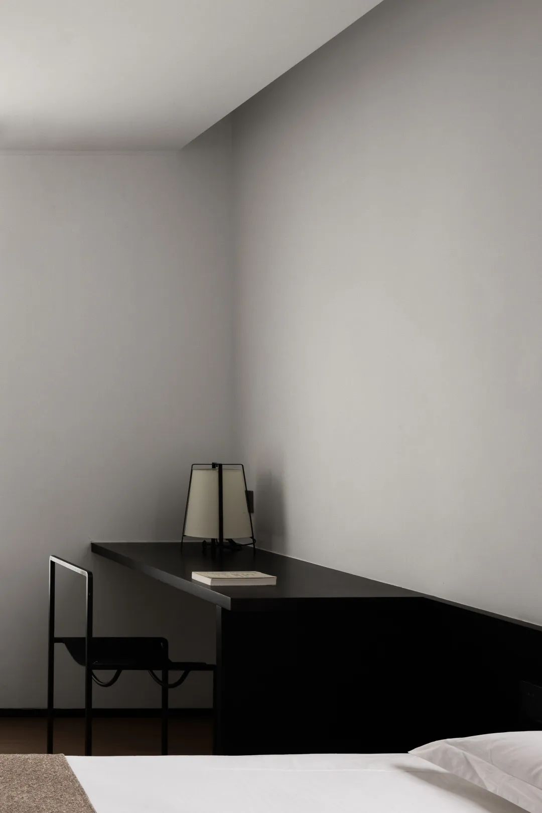 床头半裹于醇厚木体中,复又笼罩于溶溶灯光下,保护式的叠加设计带给入睡者更多的安心感。黑色在此空间中再次置入,给予一种感官上的放松的明示,与白色的主色调共同围合起足以让人全身心沉浸的舒适环境。