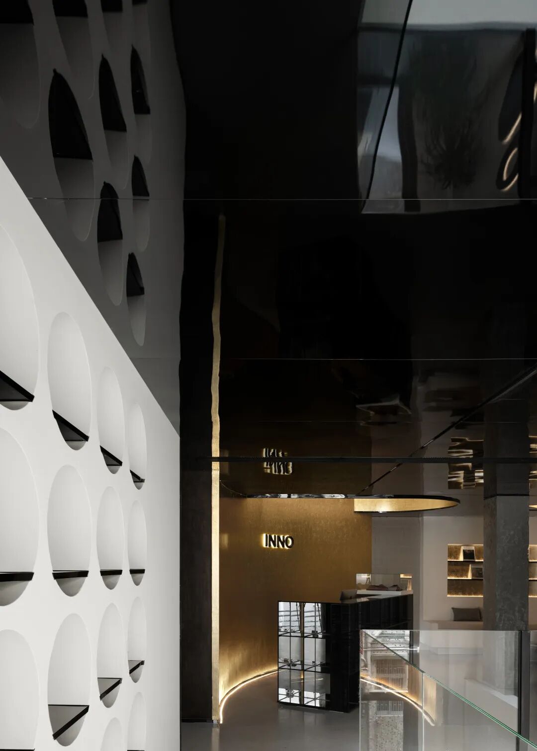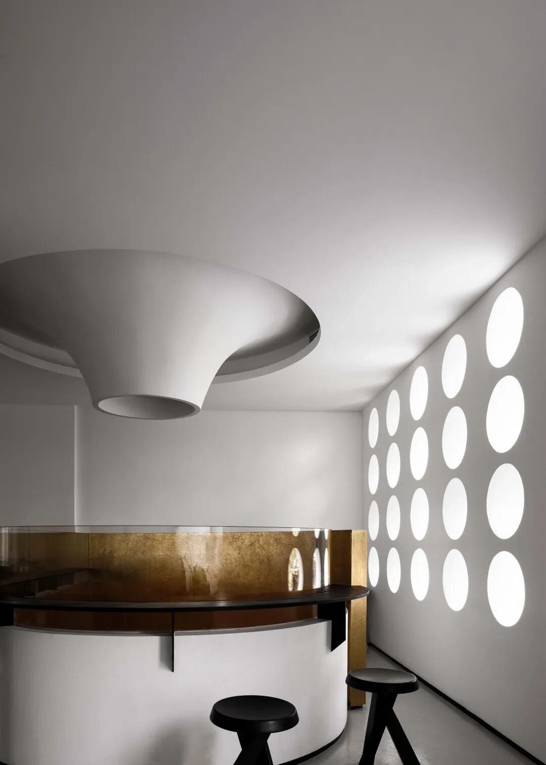 Consciousness moves upwards with the gold leaf and gathers at the top of the café upstairs, and the spatial connection is enhanced again in the interaction between the upper and lower floors. The rows of windows on the two walls like searchlights are opposed to each other and mirror each other with the "eyes of the future" at the ceiling. Visiting and overlooking in a circular world, the deceptiveness of vision confuses the real and the virtual.