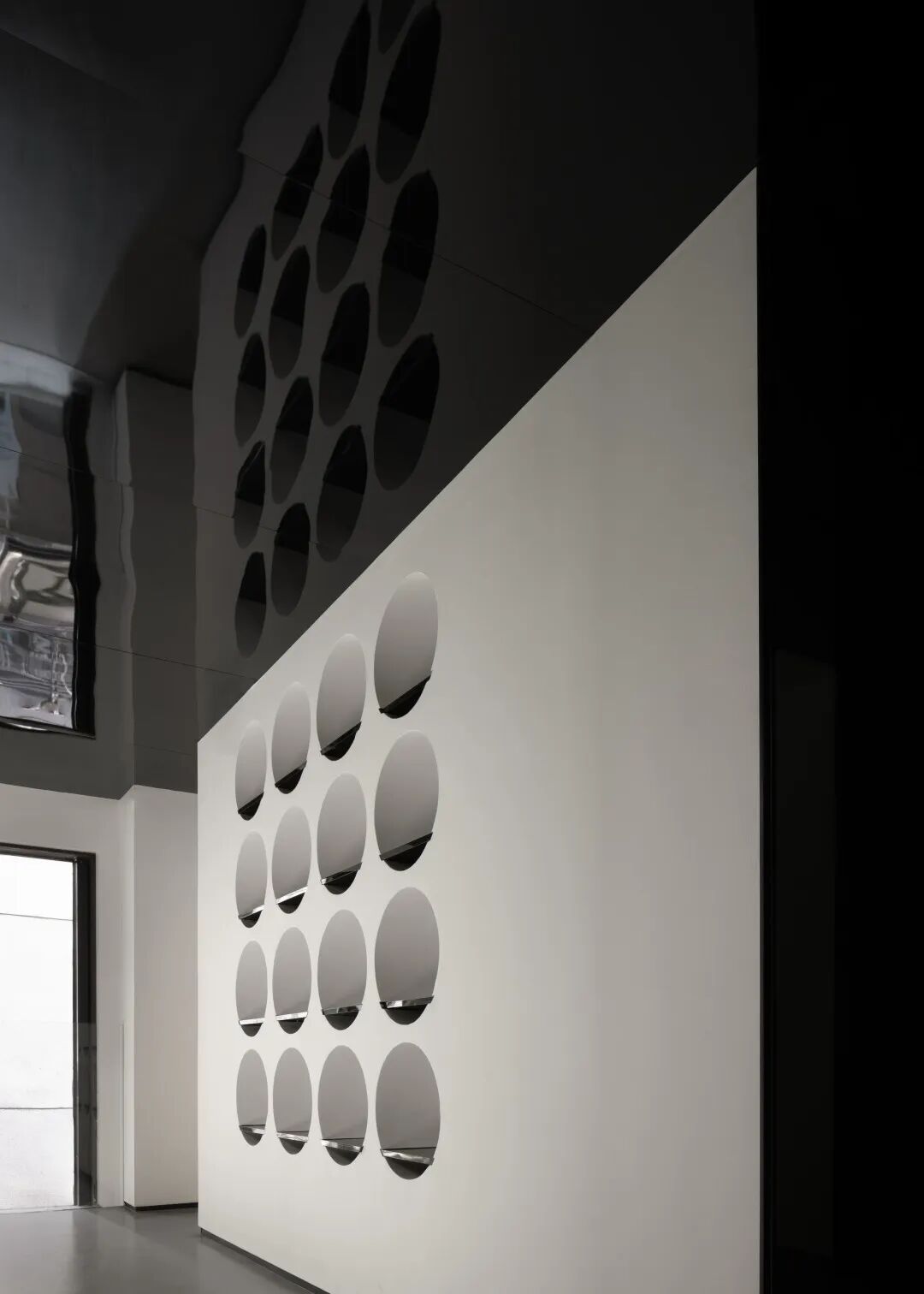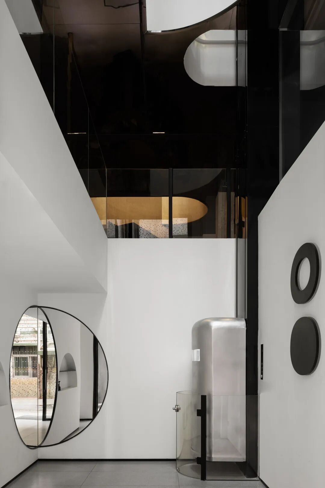 The first floor of the entry is a guide for the conversion of consciousness. The mirrors are perpendicular to each other, which makes the picture cycle appear. The external scenery and space pedestrians are intertwined in the picture, which increases various interactions between indoor and outdoor, people and the environment, and also changes the arrangement order of space things.