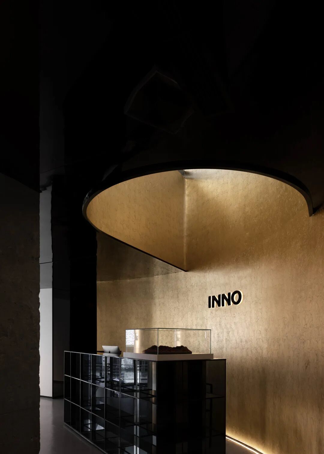 金箔在此作为民族文化符号登场。它随着破开的黑色天花板旋转上延,宛若初现的明媚日光,在宇宙序次中营造出全新的视野广度。明暗的对比强化了本体自带的文化质感,也在与空间的艺术重组中,丰富了情感与视觉的体验。