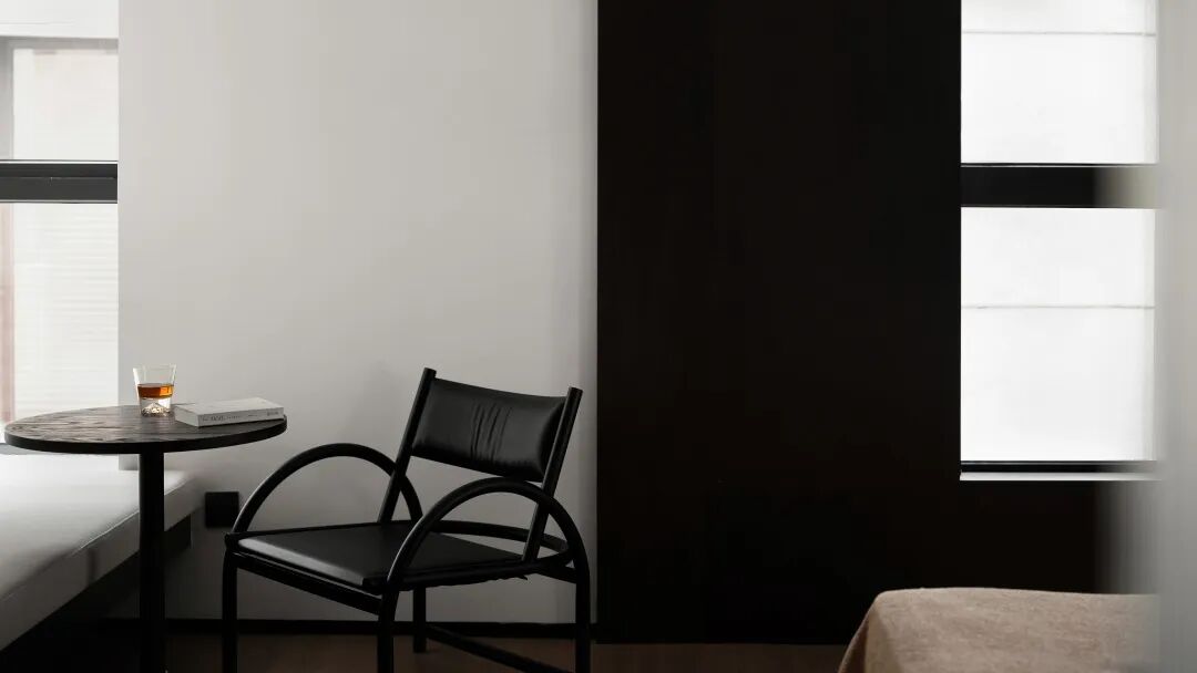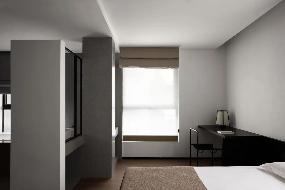 The headboard of the bed is half-wrapped in the wooden block, and then shrouded in soft lighting. The protective design brings more peace of mind to the sleeper. Black is placed again in this space, giving a sense of relaxation, and together with the main color of white, it encloses a comfortable environment that is enough to make people immersed.