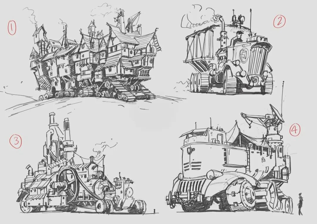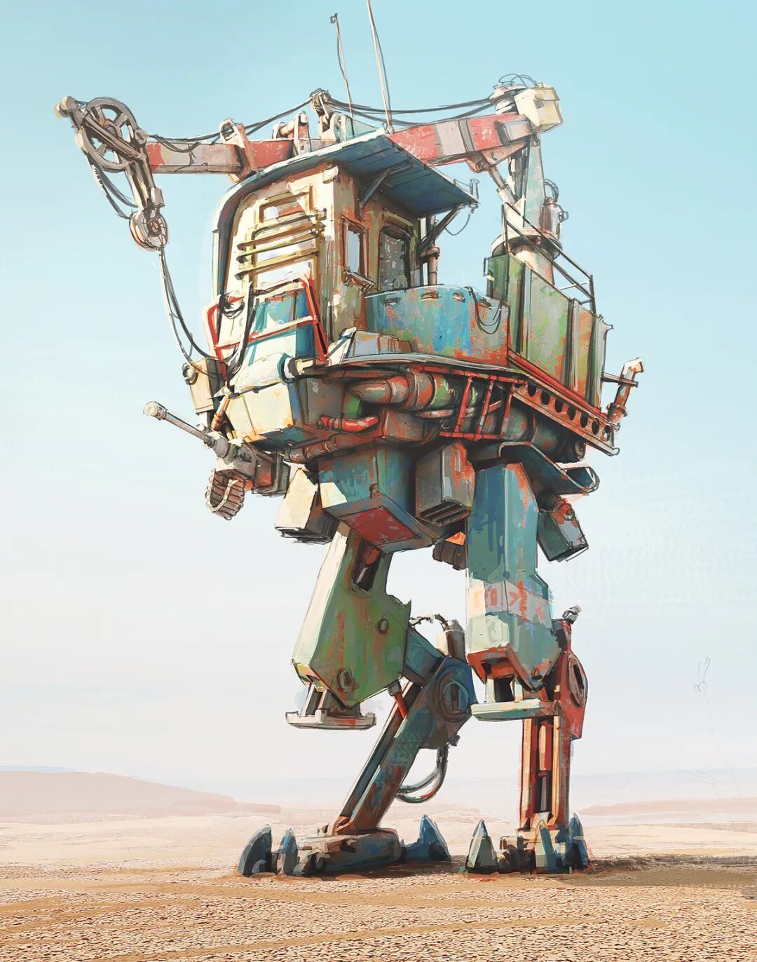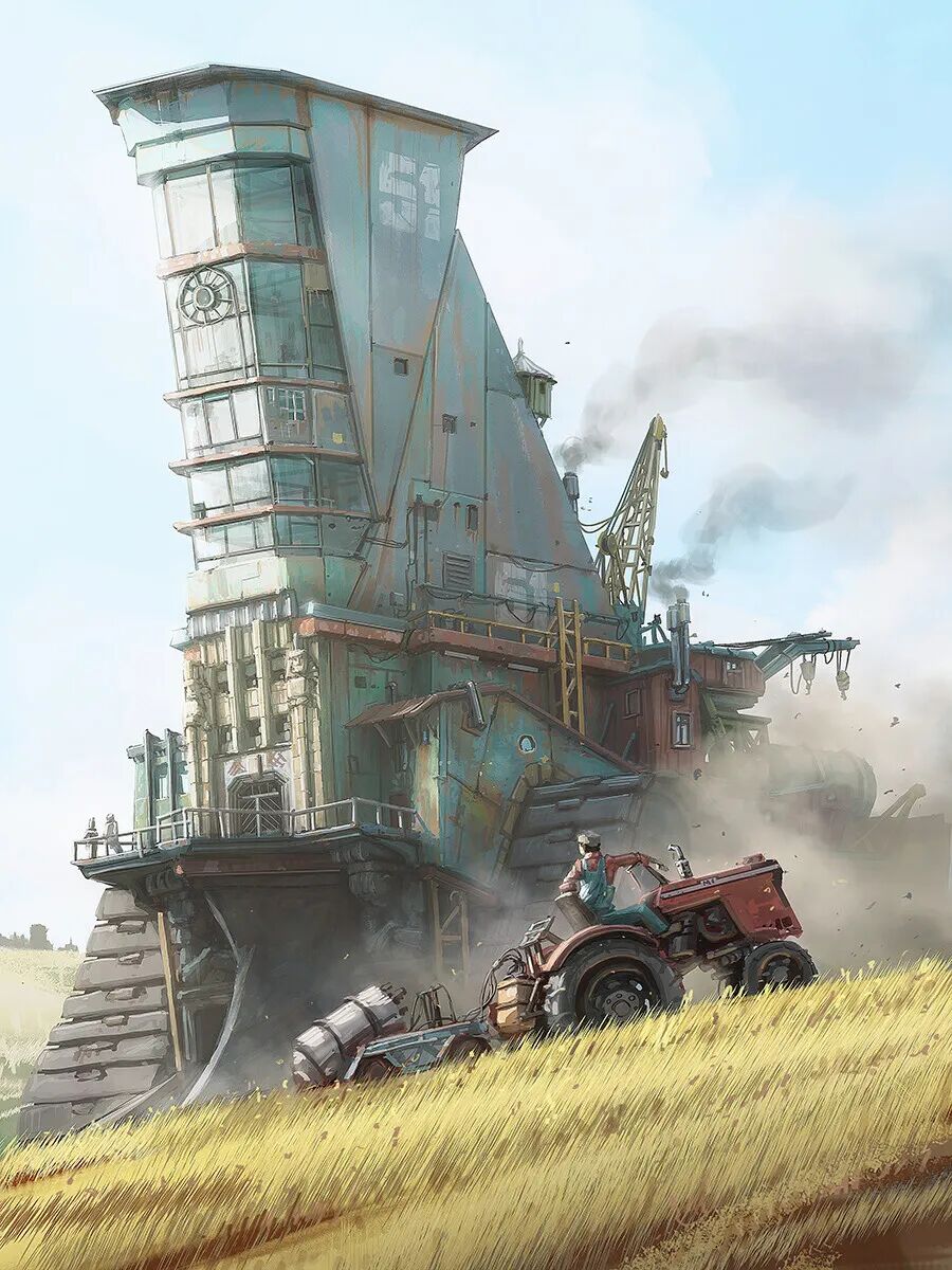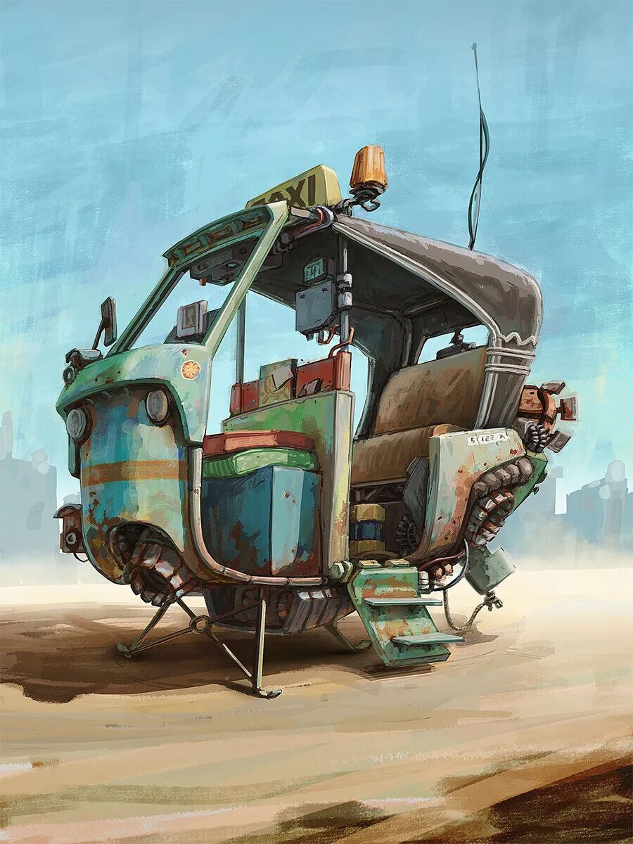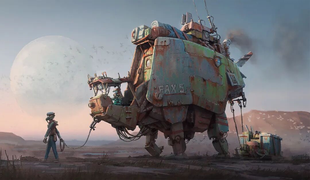 Hamish Frater的个人作品大多都是末日废土风科幻机械设计,他喜欢将各种陈旧的机械部件改装组合在一起,创造出新的、富有想象力的结构,作品色彩比较复古,特意保留的笔触感、划痕以及锈斑凹痕等细节的添加使得整体更加真实。