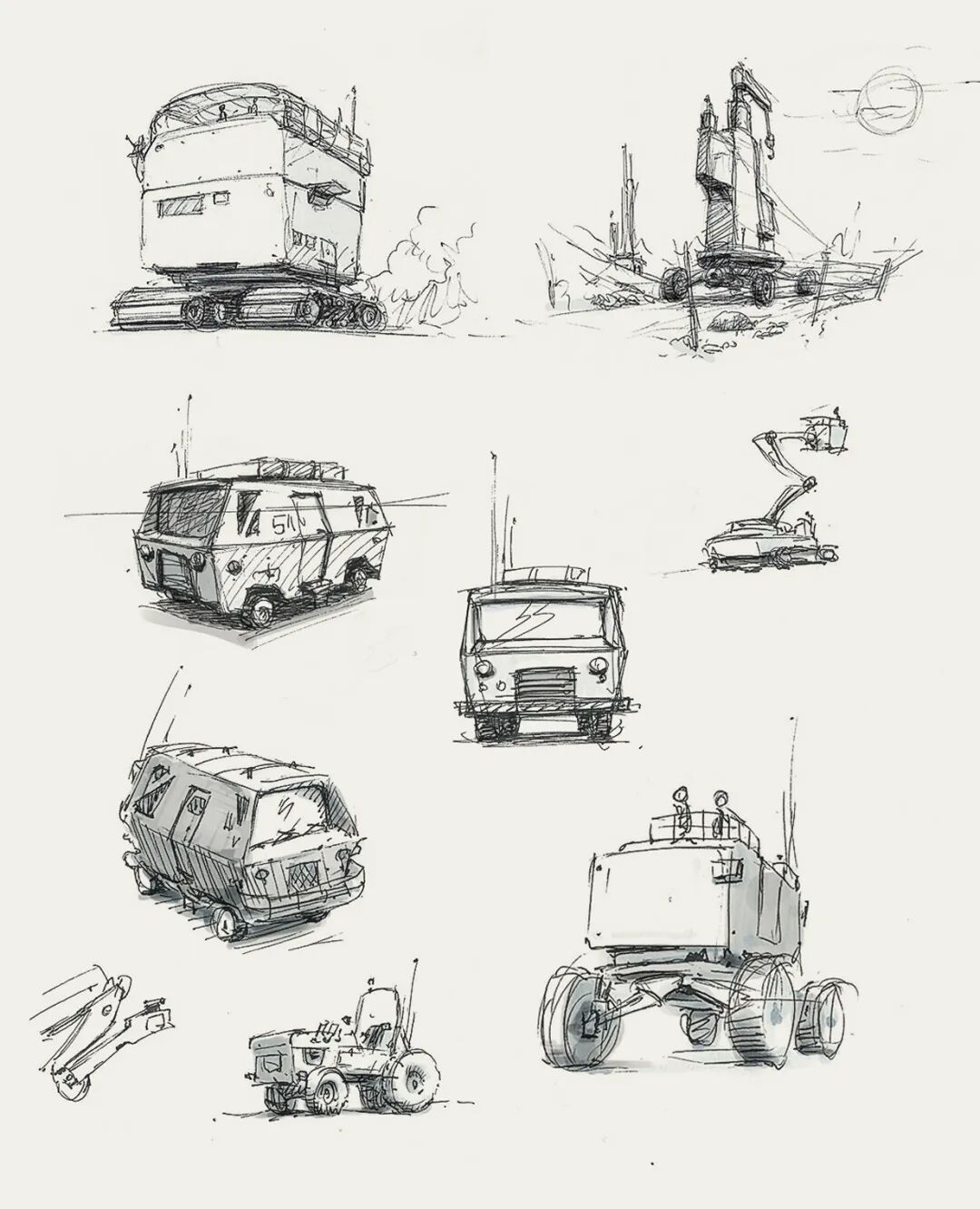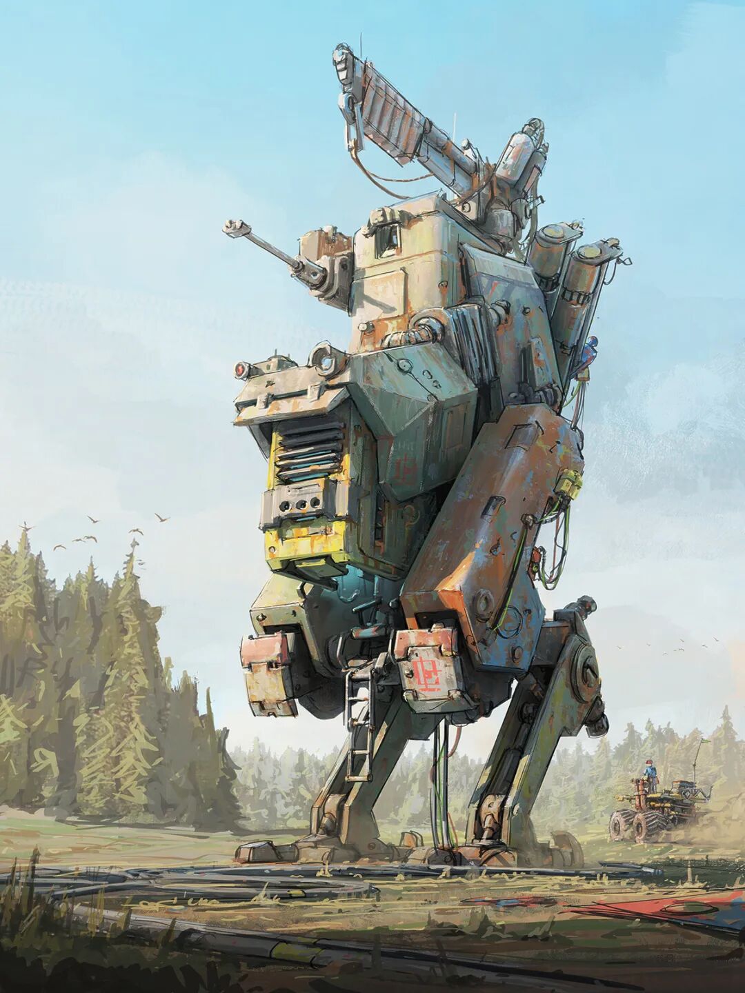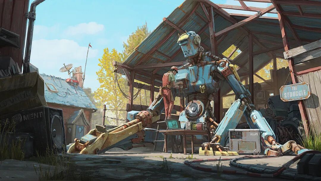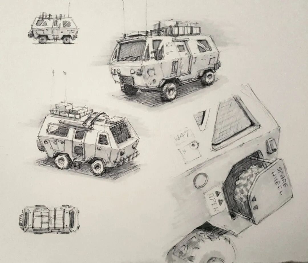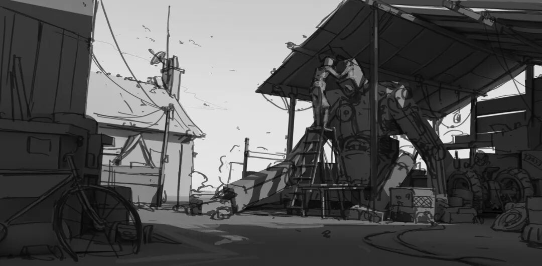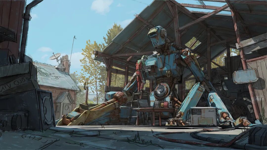 Hamish Frater的个人作品大多都是末日废土风科幻机械设计,他喜欢将各种陈旧的机械部件改装组合在一起,创造出新的、富有想象力的结构,作品色彩比较复古,特意保留的笔触感、划痕以及锈斑凹痕等细节的添加使得整体更加真实。