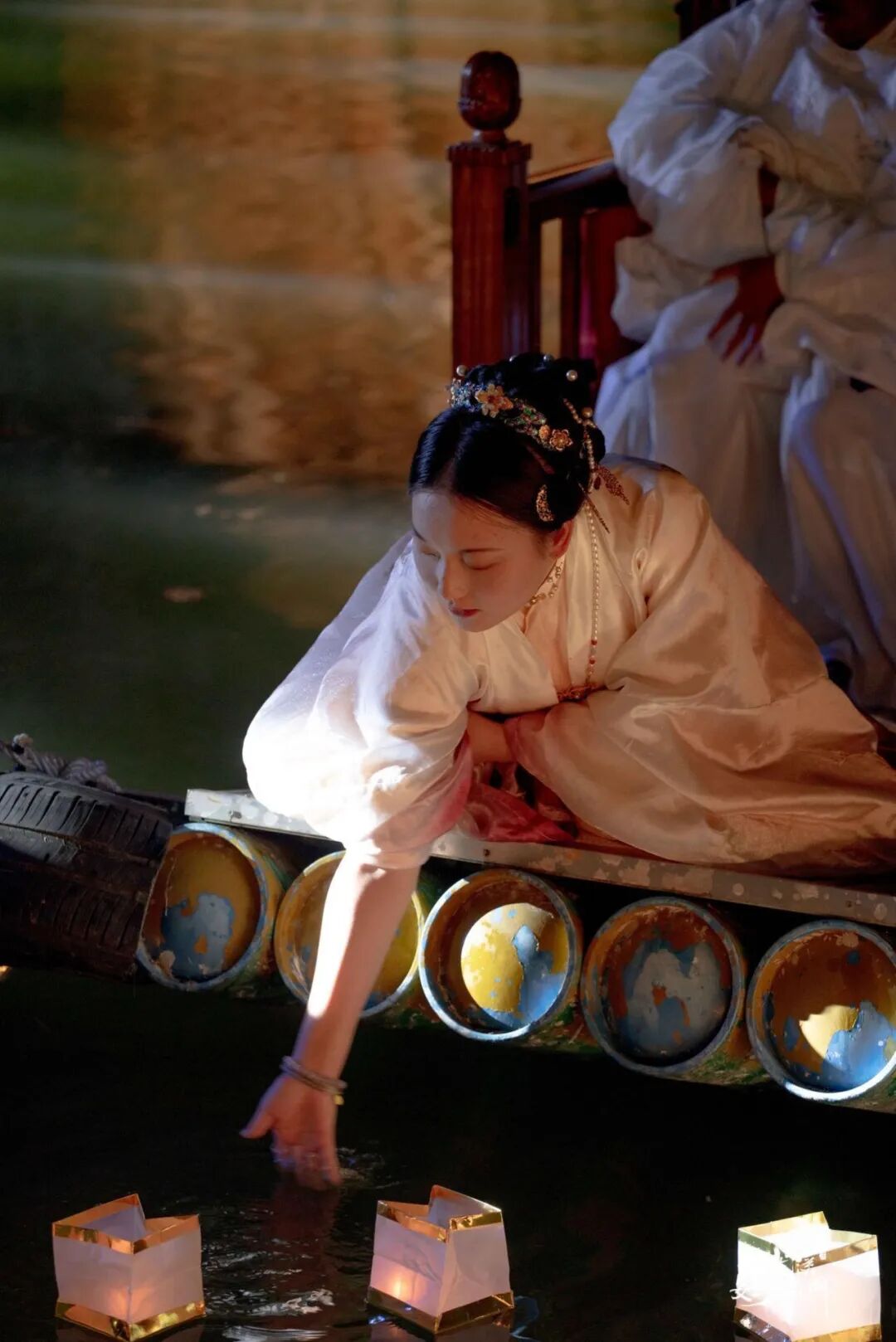 伴随着亮灯仪式的启动,黄龙溪上泛舟的汉服同袍们将手中的河灯放在水里,让美好的祝愿和思念伴着河灯在潺潺流水中飘向每个人的心之所向。