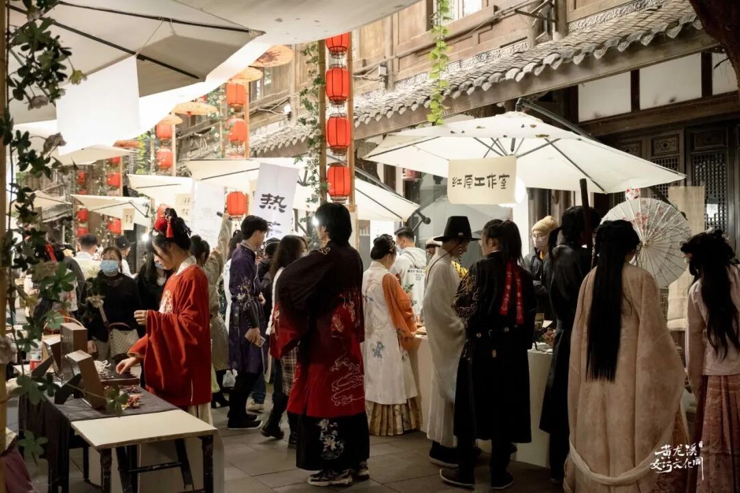 为期四天的活动精彩纷呈,饮食、茶道、汉服、民艺、华服、善歌、诗词、点茶、行酒、河灯、古桥等文化元素共聚在黄龙溪畔的古镇之中,围绕东方古韵美学重现了黄龙溪古镇的繁华盛景。人们游创意市集、逛非遗传统技艺摊位、看非遗表演、体验汉服游园、赏诗词歌赋、放河灯祈福、猜灯谜,在好吃、好玩、好看中领略着中华优秀传统文化与非遗的魅力。