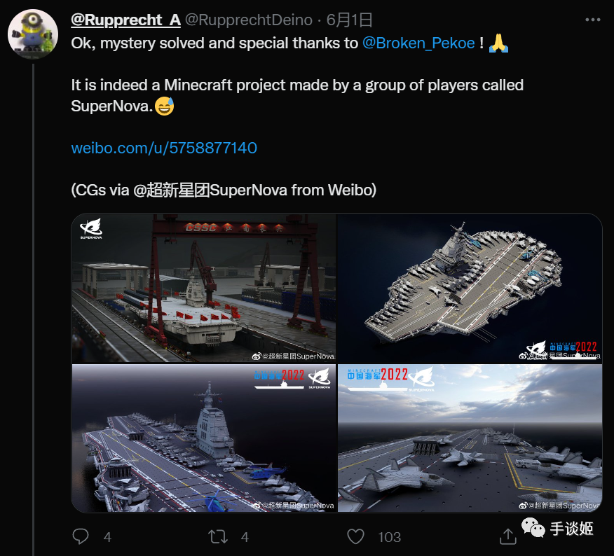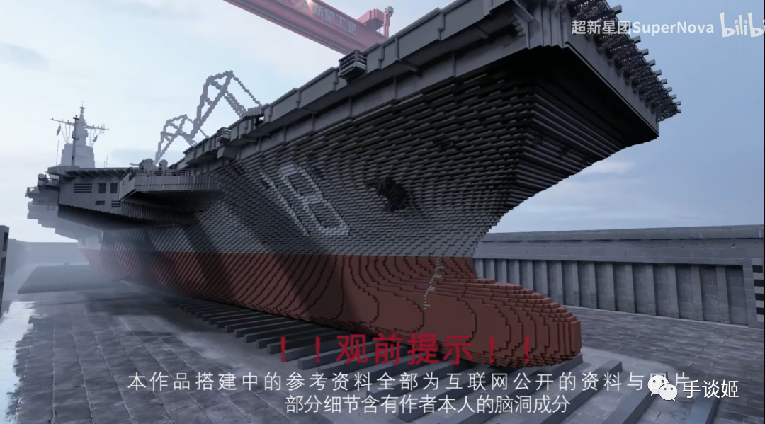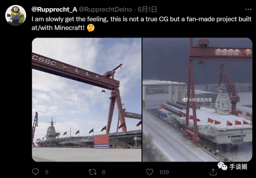 首先6月1号,这张图不知道被谁传播出去,有推特的老外军事博主看到,说,他知道大家对中国的003号航母很感兴趣,但是下面这个图不是真的!一开始博主觉得是CG,但细看更觉得是《我的世界》中搭建的。