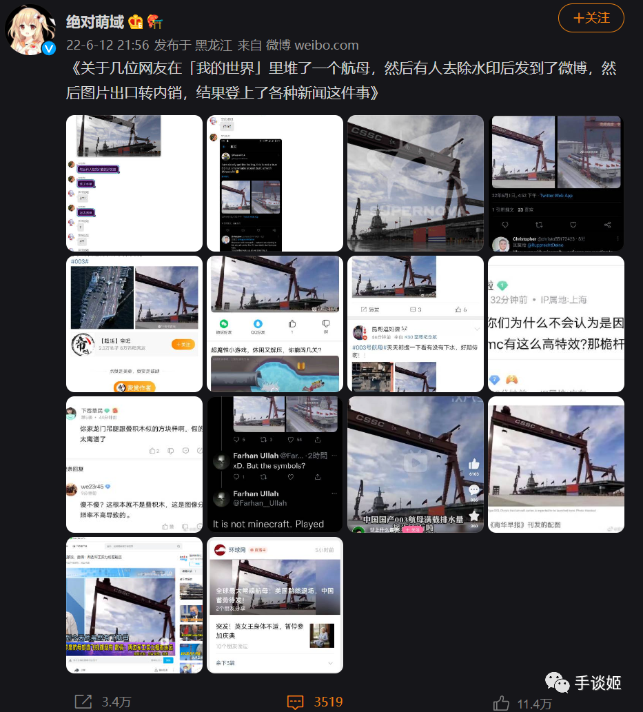 最近博主“绝对萌域”就分享了一件名为《关于几位网友在「我的世界」里堆了一个航母,然后有人去除水印后发到了微博,然后图片出口转内销,结果登上了各种新闻这件事》的轻小说级趣事。