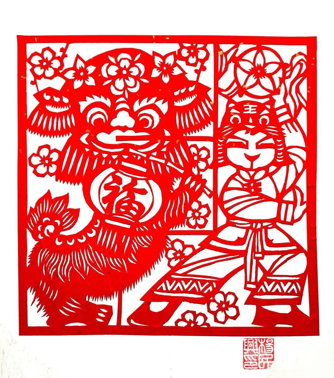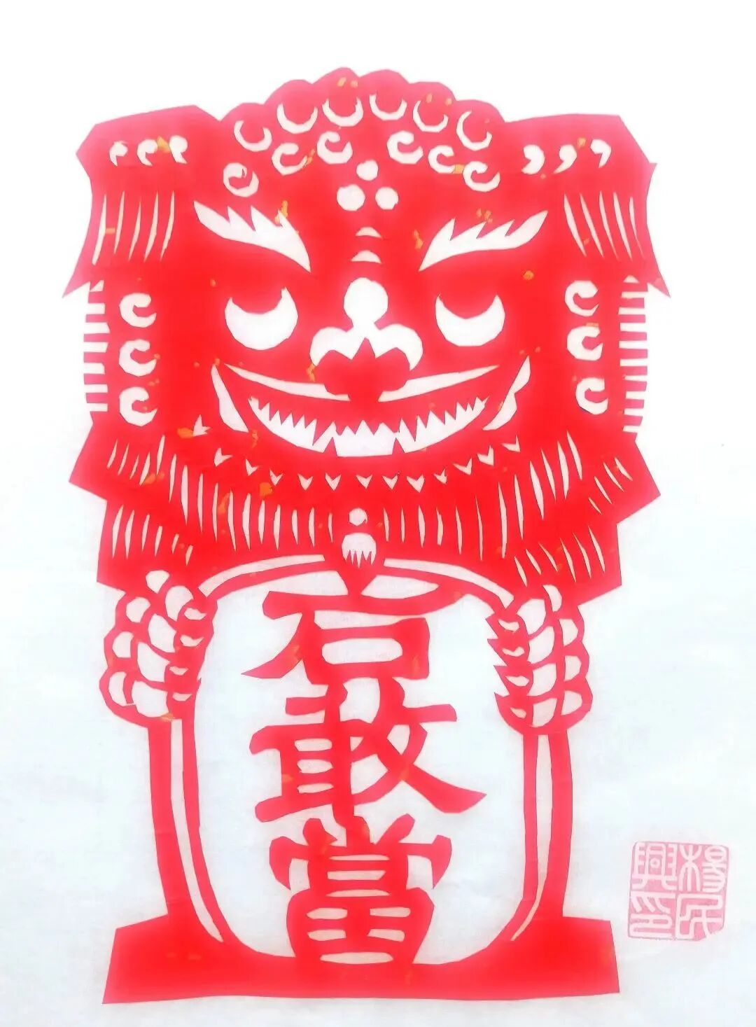 泉州的福狮文化非常有名,大街小巷随处可见狮子造型:石墩、建筑角落等,石敢当具有防卫、镇宅寓意,将它化为剪纸形象,寄托着美好愿望。