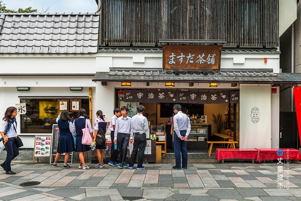 宇治还大力发展「茶」主题旅游——有主打茶道的宇治茶道场、对凤庵等;也有平等院前的茶主题商业街,街上是围绕茶从喝到吃的各类茶衍生产品。即使对茶提不起兴趣的人,对琳琅满目的茶主题冰淇淋、芭菲、蕨饼、威化、生巧没什么抵抗力。