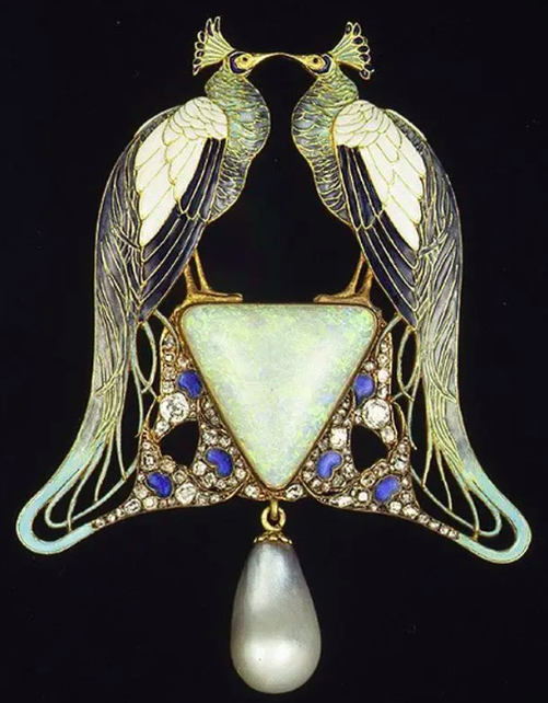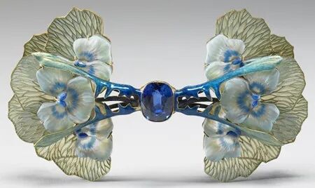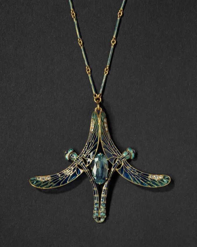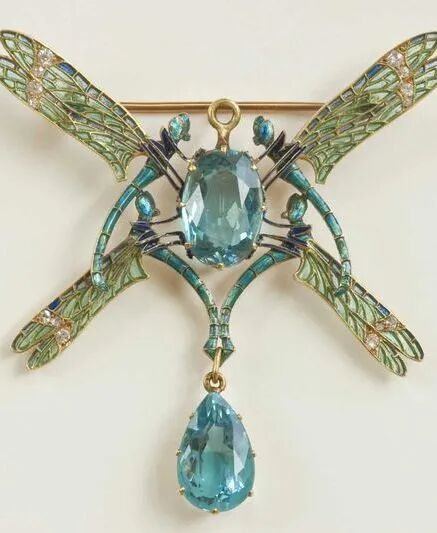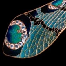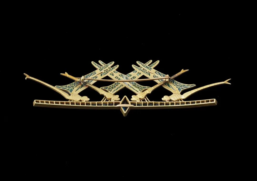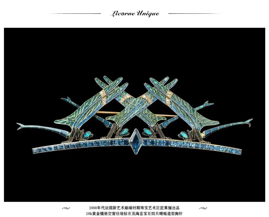 而这件富有浓郁新艺术风格的蜻蜓胸针可谓是代表了莱俪珠宝作品的最高水准。胸针之形展现出强烈的对称之美,整体典雅轻巧。