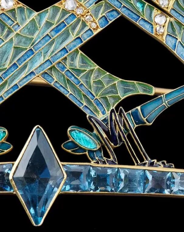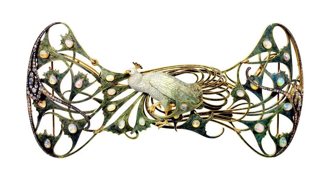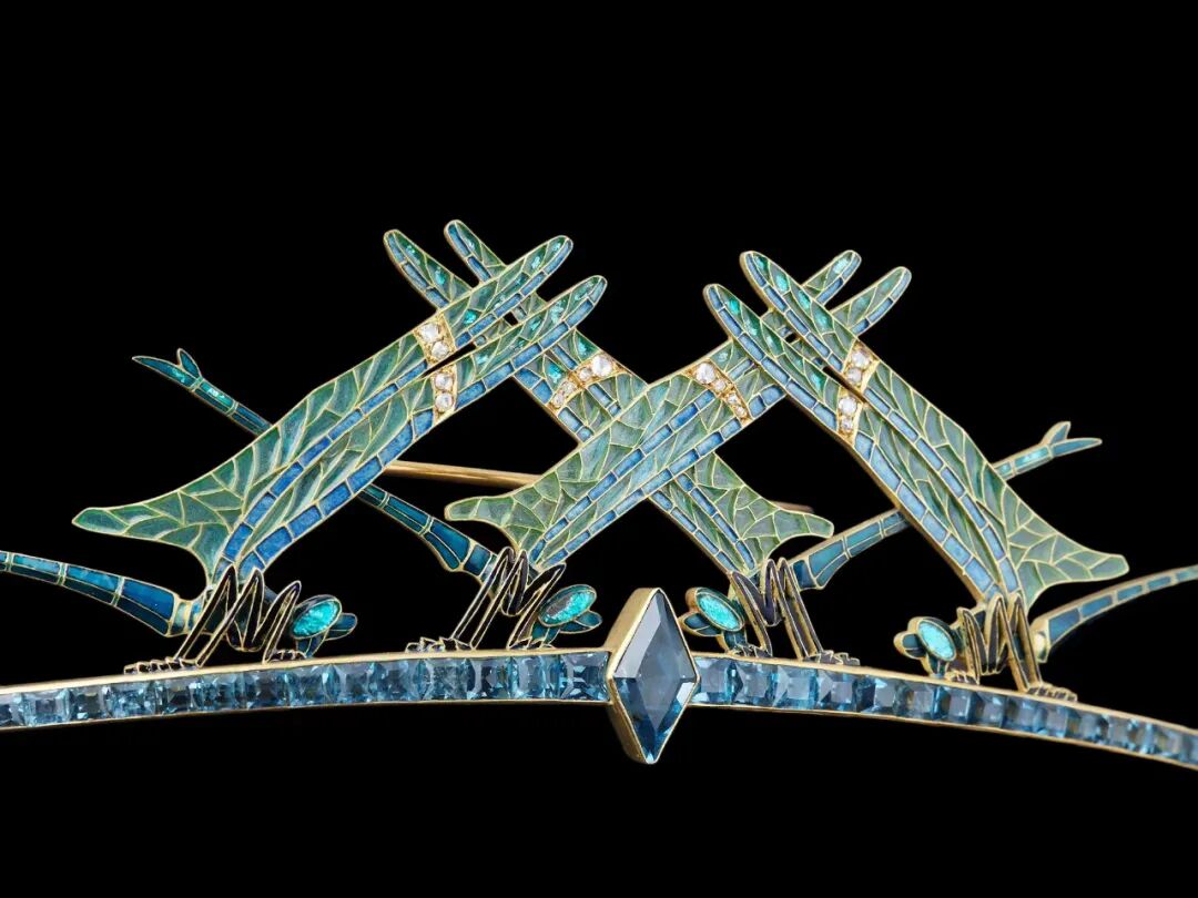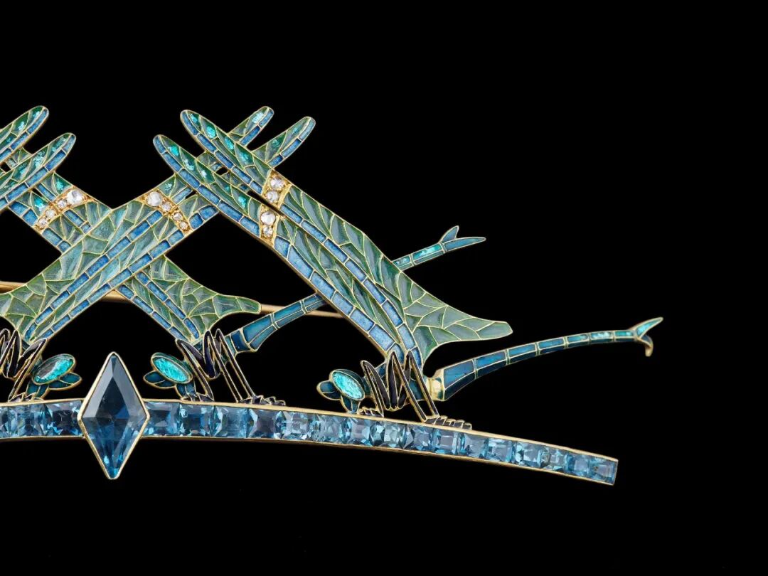 剔透的空窗珐琅化为纤细翼翅,并点缀着细密钻石,黄金的璀璨光色在底部依稀可见,再现大自然的灵动生机,不愧为新艺术时期的顶级艺术品。