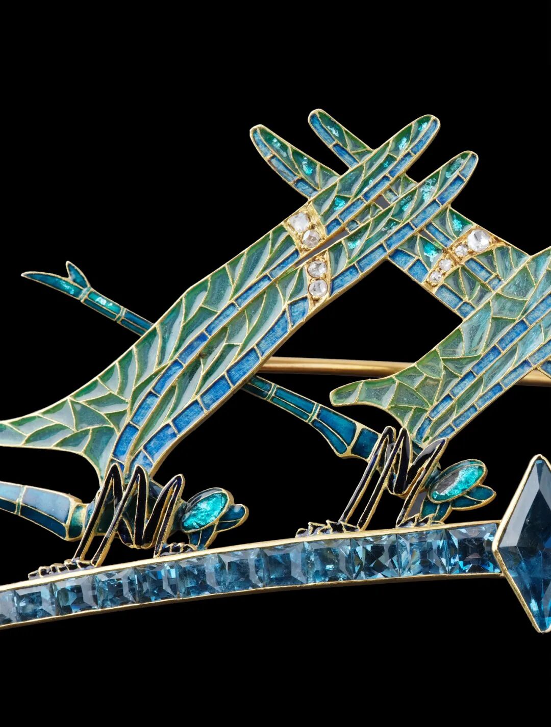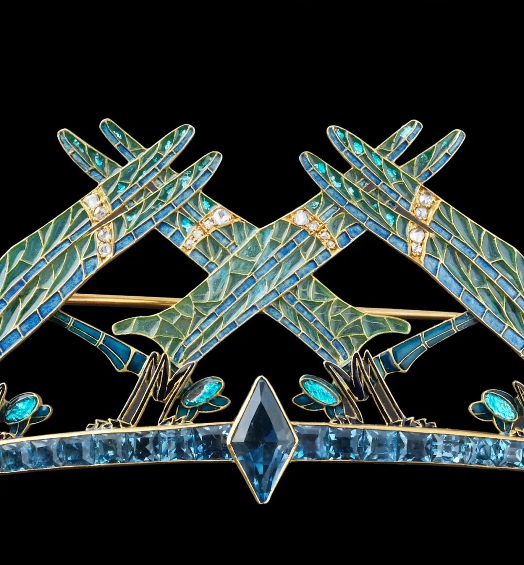 而在莱俪的珠宝作品中,空窗珐琅技法无疑是最能代表新艺术珠宝之精湛华美的工艺,此件胸针的蜻蜓双翼便皆由空窗珐琅制成,精美卓绝。