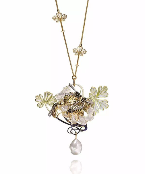 这件以空窗珐琅工艺打造,并嵌有一颗天然珍珠的莱俪花卉造型项链,曾以约合人民币730万元的天价成交 / 佳士得