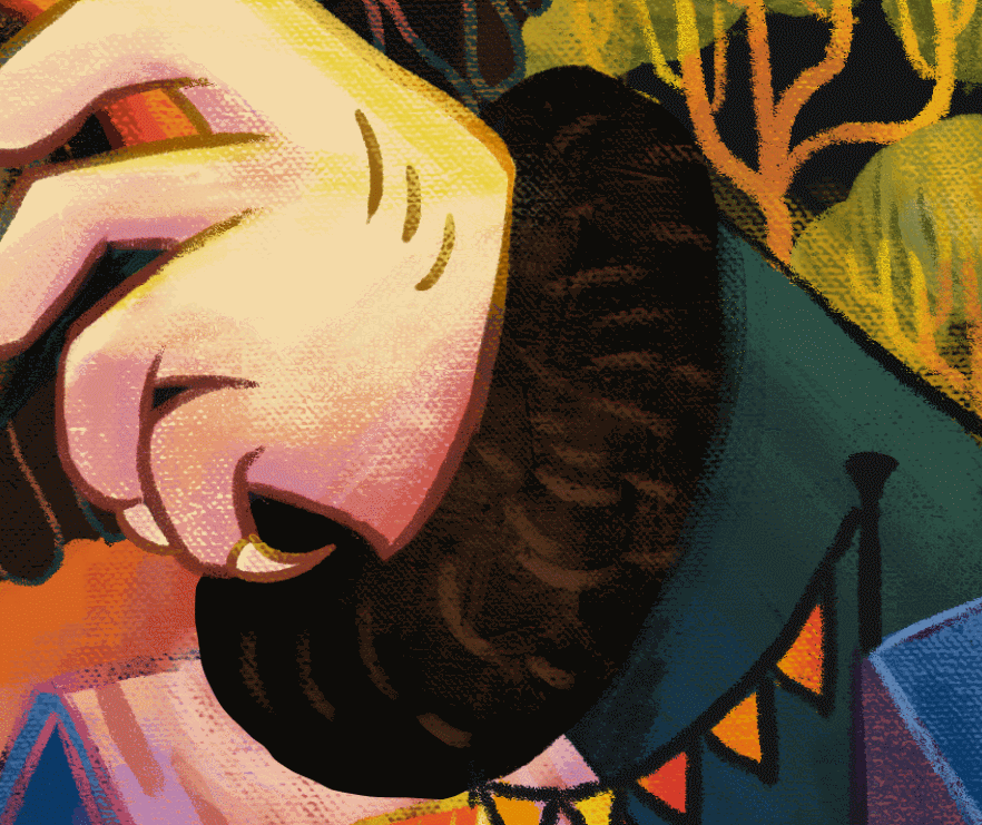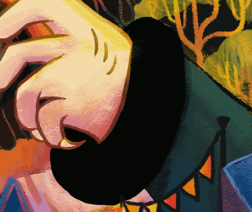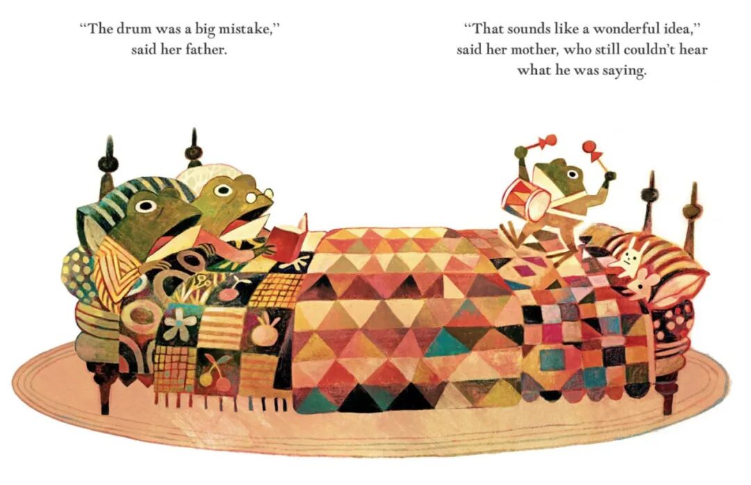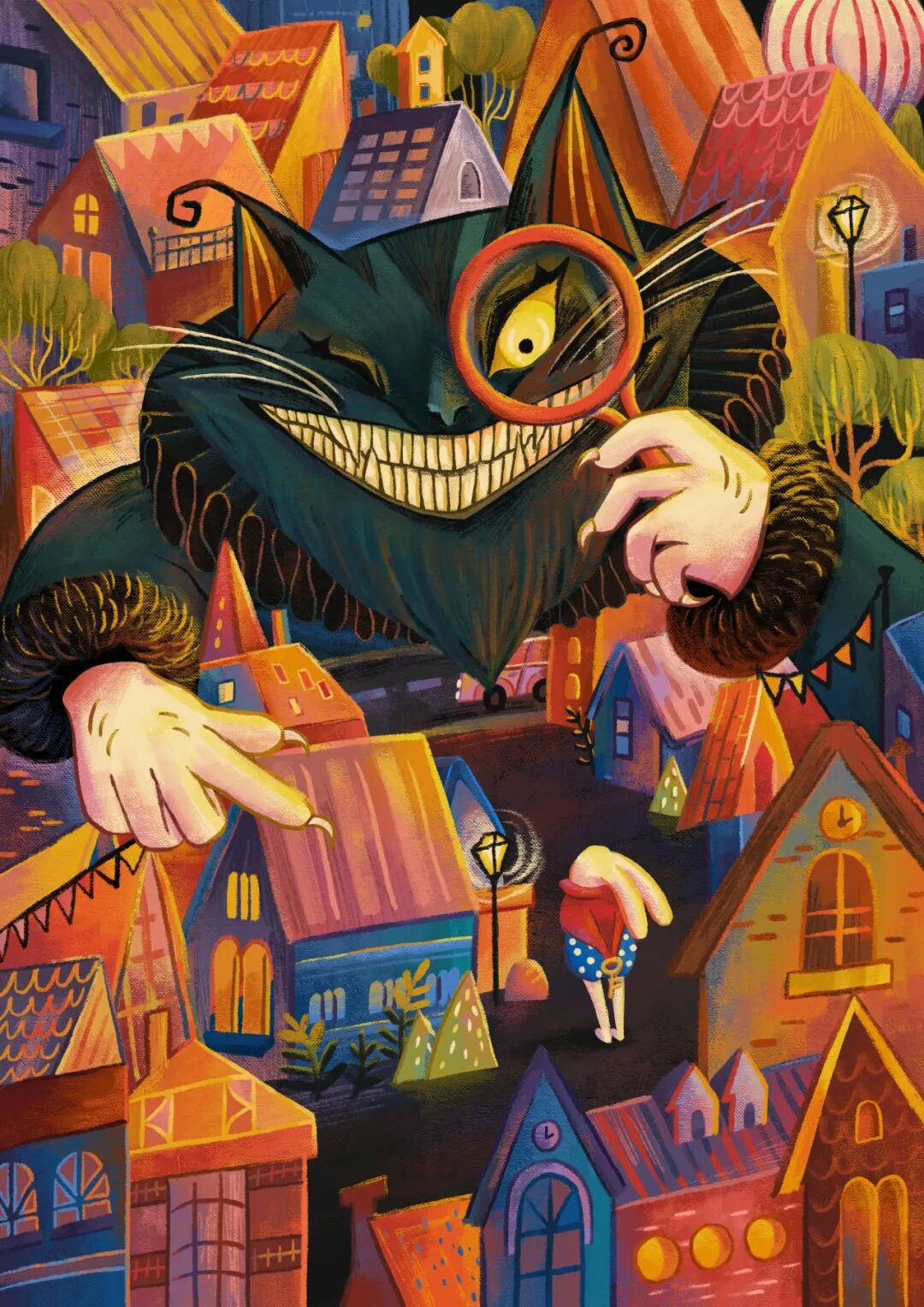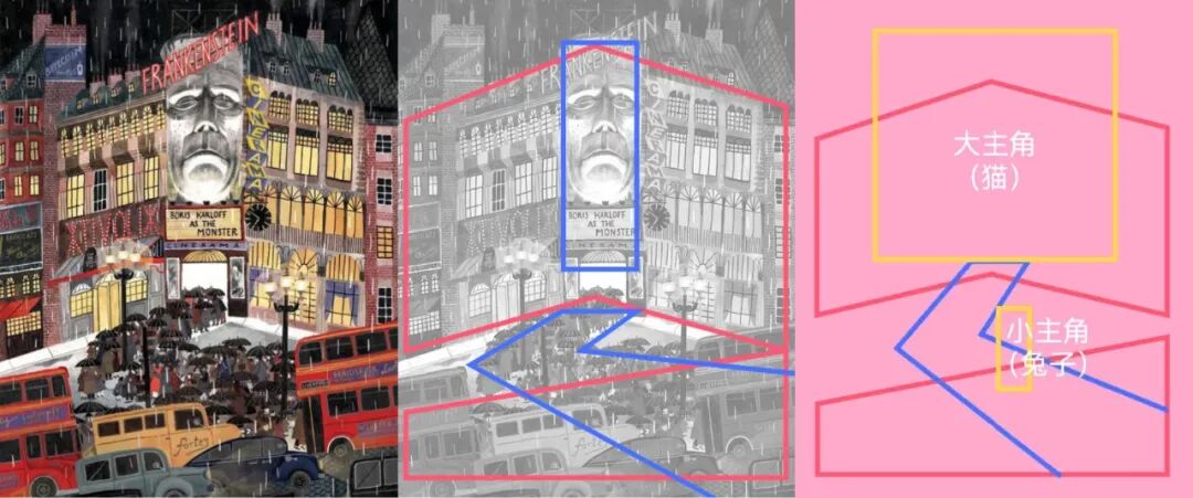 在明确要做主角对比强烈的画面时,我找到绘本插画师 Julia Sarda 的一副画面作为参考,这幅画面不管是构图形式还是故事都极其吸引人的眼球。我们可以分析出画面中大的块面,在大块面的基础上进行微调,从中得出我们的构图。