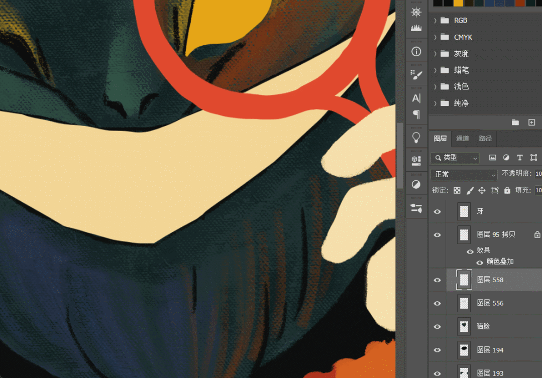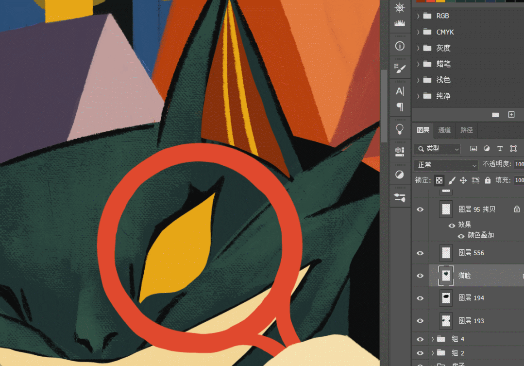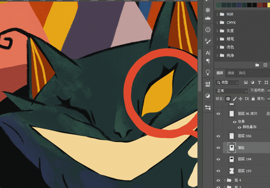2. 为了让猫头色彩更丰富,可以用【村口粉笔铺色3】绘制猫头的环境色。