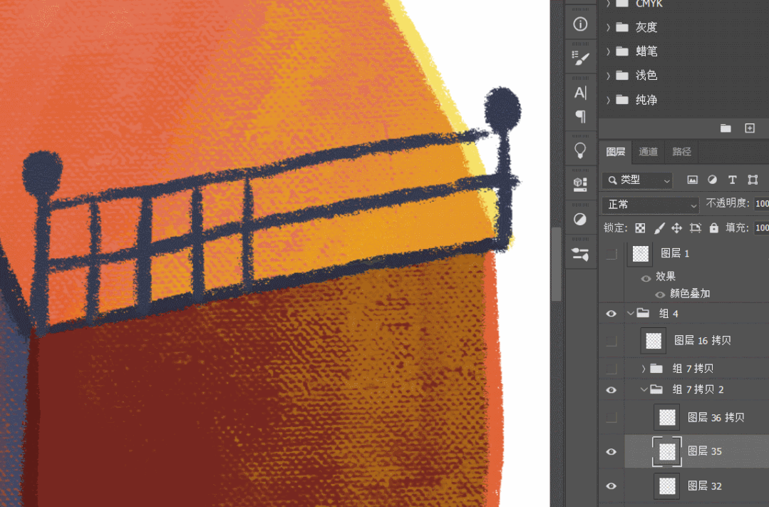 1. 让我们拿出刚铺好的大色稿,先用【村口粉彩铺色2】 画出亮面和暗面,在用笔的时候注意力度适中,保留笔触肌理感。