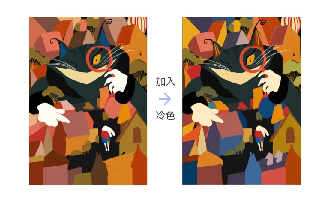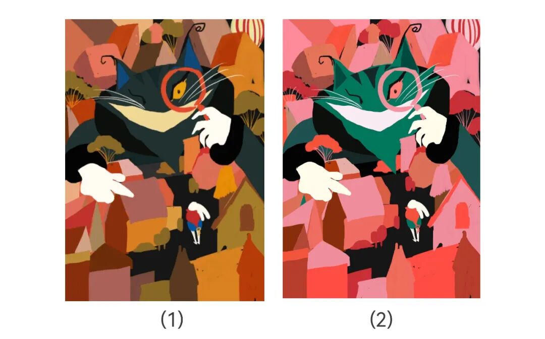 b. 接下来房子的面积占比在画面中和猫咪一样多,那么我们就将橙色,及相邻的红色黄色给予房子,在不破坏整体色调的同时制造丰富的质感和层次,参考图(1)。用这种方式我们还可以创造出更多不同的配色,参考图(2)。