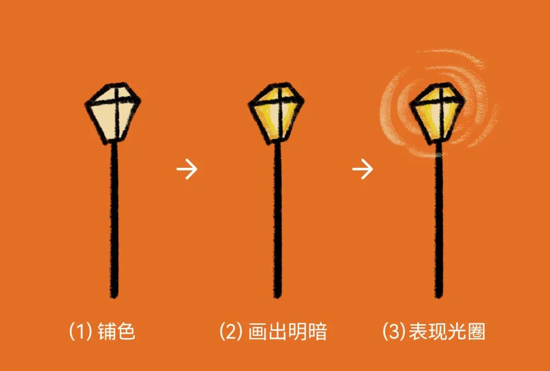 用【村口粉笔铺色3】,绘制路灯的明暗,最后绘制光圈,路灯的刻画就完成啦!
