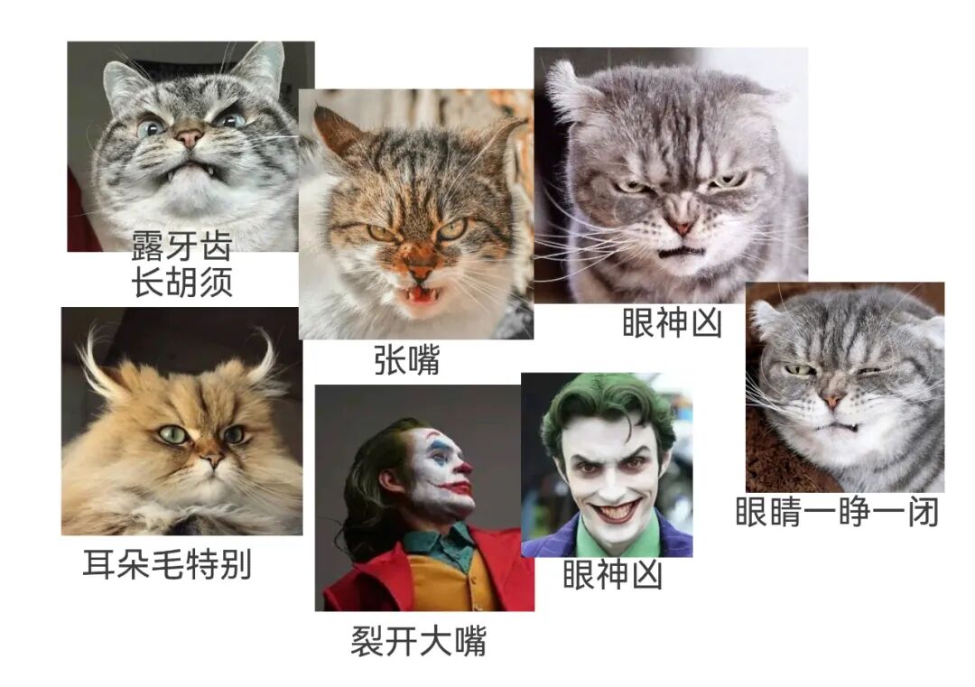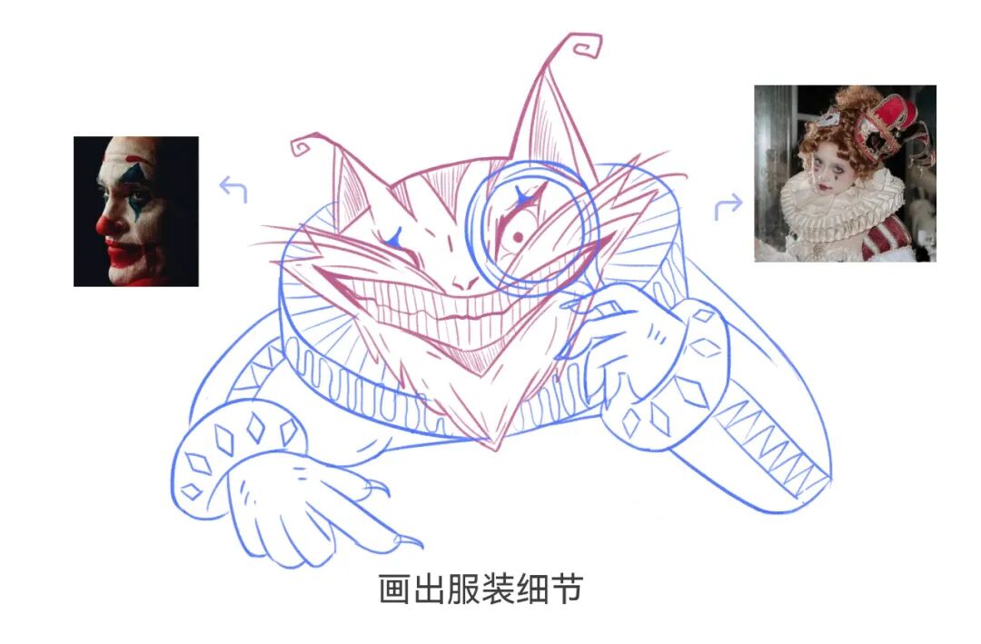 1. 搜集素材:猫的形象我倾向于设计比较凶狠的角色!那么找参考的时候我们就可以着重找一下比较炸毛的猫咪。同时,我发现猫咪和小丑还是有很多相似之处的~所以这只猫我会加入小丑的角色设定,那么我们可以找一些小丑的参考结合在一起。