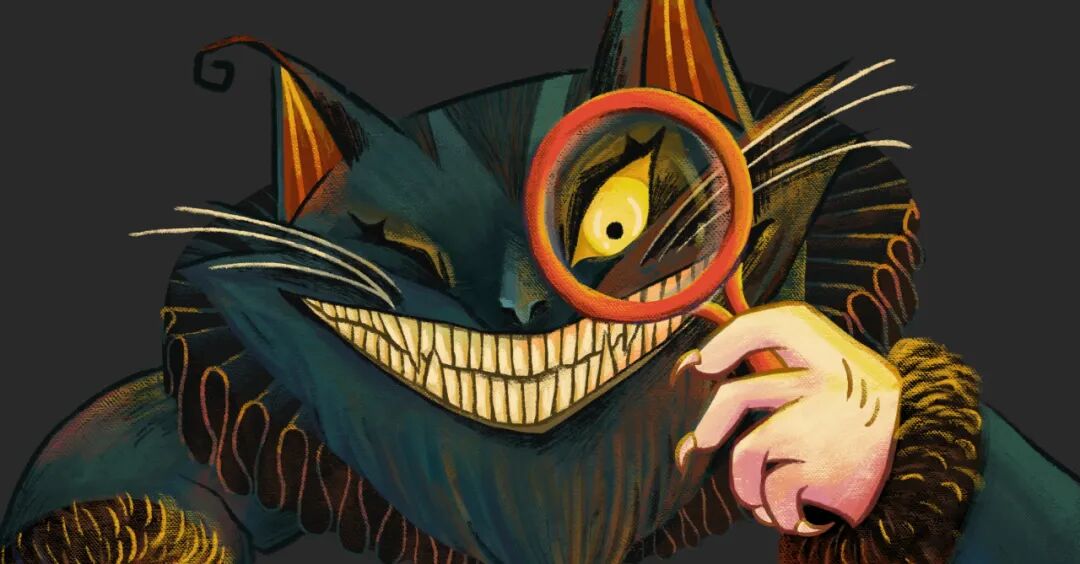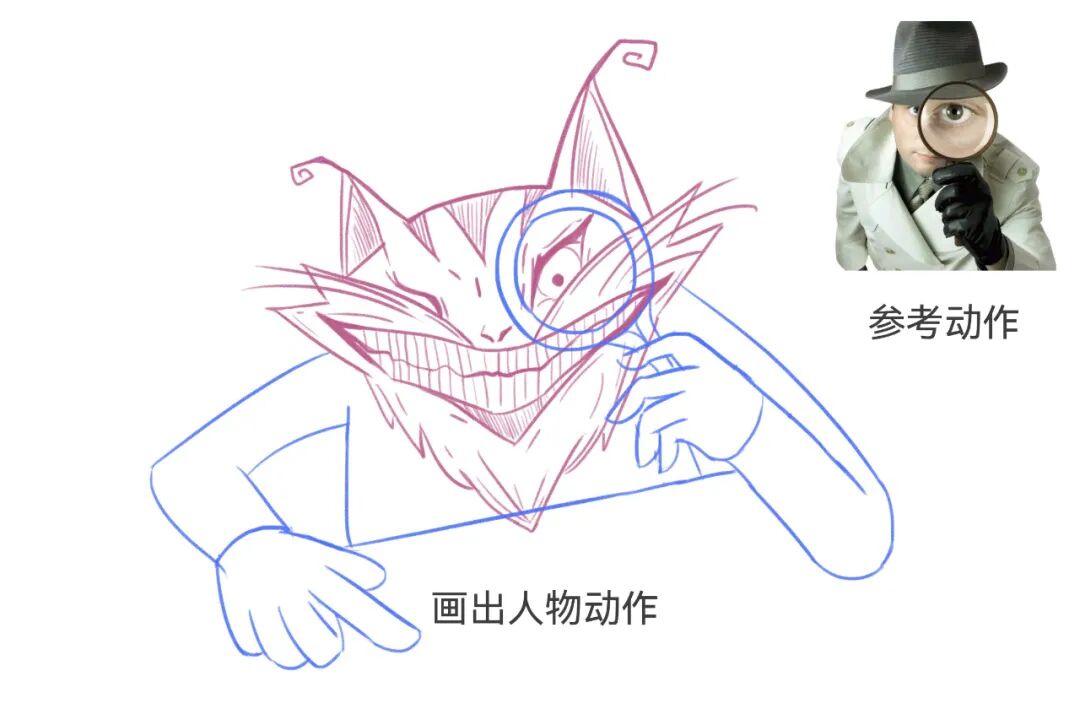 4. 绘制动态:因为猫咪的眼睛一闭一睁,可以结合拿放大镜的动作,这样猫咪的手一只指向兔子,另一只无处安放的手拿着放大镜观察兔子,那就更切合主题啦!