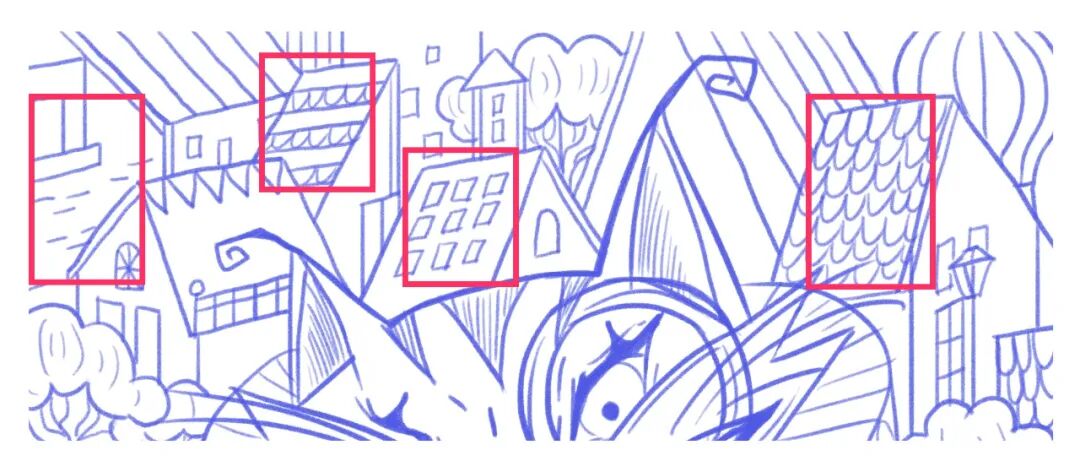 TIPS:为了让疏密关系更舒服,一般来说房顶和墙面选取一个进行装饰就好,同时相同的装饰图案要相互错开。