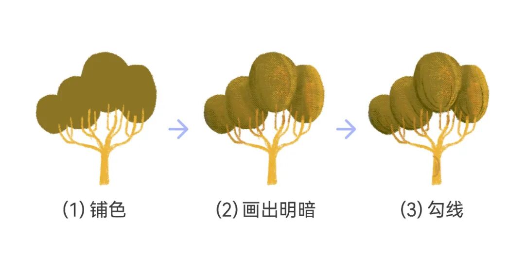 用【村口粉笔铺色3】,绘制树木的明暗,接着用【村口粉彩勾线笔2】绘制树的纹理和装饰线。