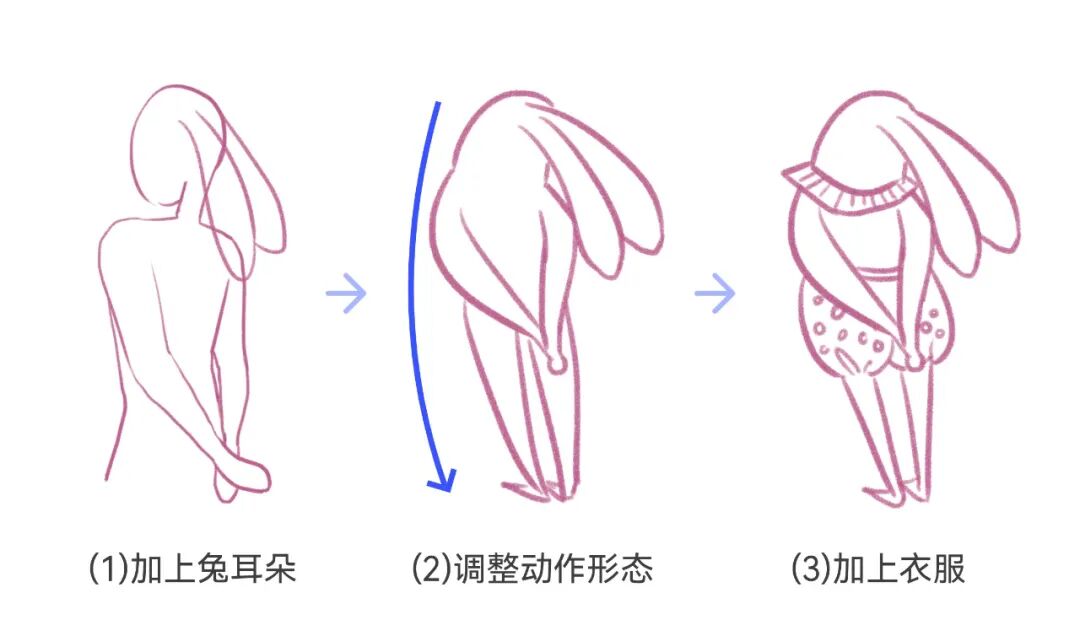 3. 调整动态并加装造:在提取的动态上加上兔子耳朵,在画兔子的时候会思考,当猫指着它的时候会有一个向后倾倒的动作,所以我们调整简化一下兔子的基本形态,来展现向后仰的趋势,最后加 上衣服就画好啦~