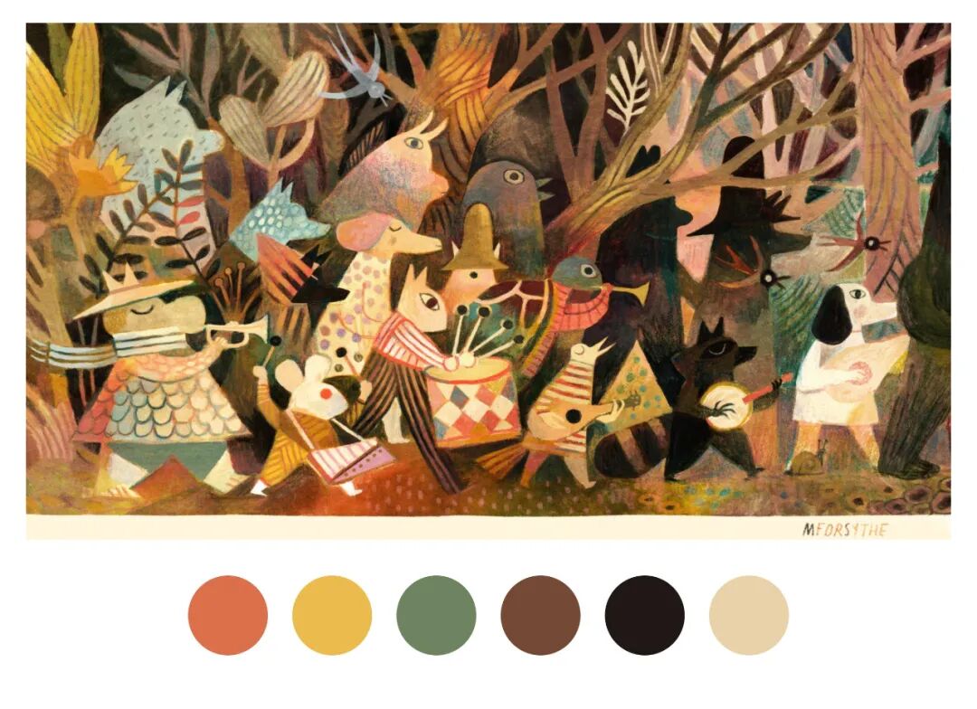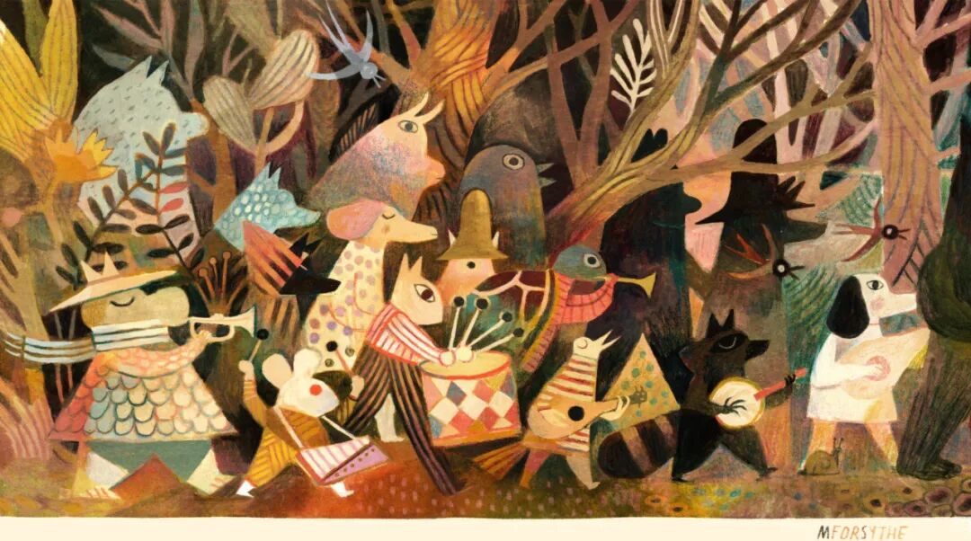 首先给大家介绍一位来自加拿大的童书作家、插画家、动画插画师 Matthew Forsythe。他非常擅长画森林,城市风格插画,画面主角以拟人化动物为主,并且塑造的每个动物形象都深入人心,用色大胆且富有变化,细节丰富细腻且统一。